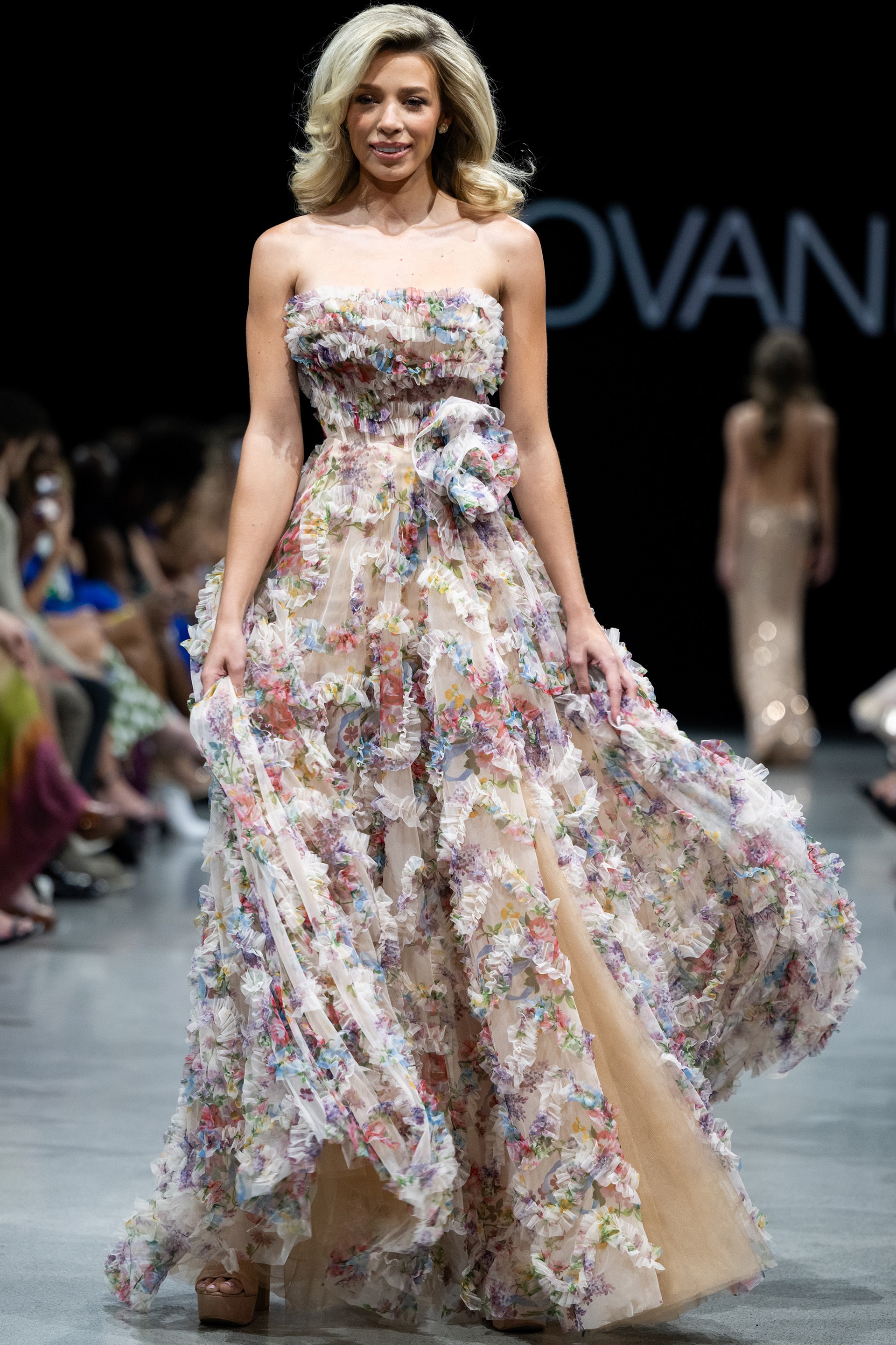 Multi Colored Ruffled Strapless Couture Dress 38650. This enchanting and exquisitely designed strapless gown is perfect for making an elegant and memorable statement at any special occasion. Featuring delicate ruffles and a breathtaking floral print, this couture dress is made with fine organza fabric that gently flows to the floor length. The A-line silhouette flatters any figure while the ruffle details add a touch of whimsy and grace. The sleeveless design and strapless neckline complete this stunning ensemble, making it an irresistible choice for a fancy evening event or a glamorous party.