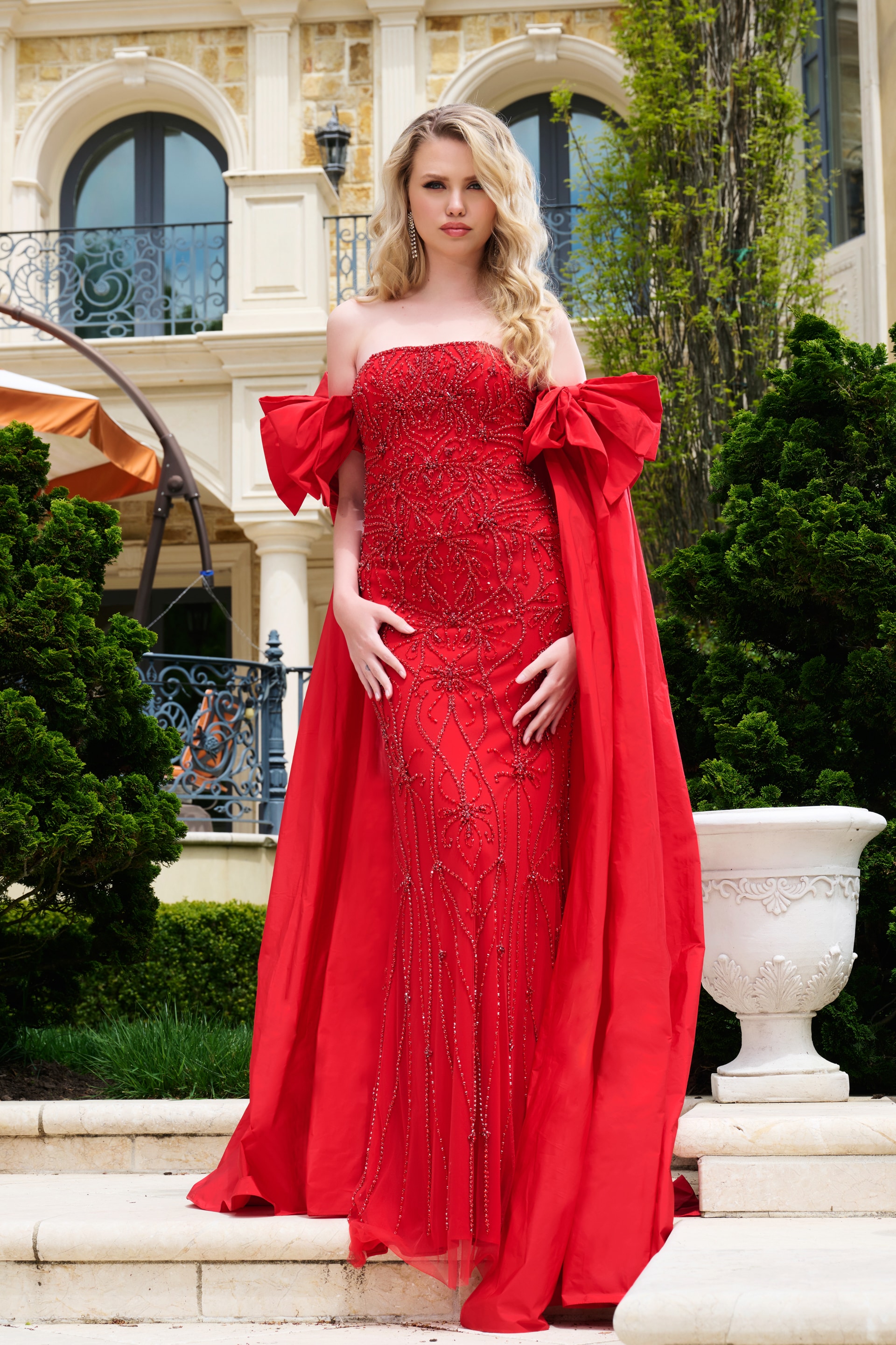 Make a bold statement with this stunning strapless mermaid gown. The gown features intricate beaded details throughout, creating a dazzling effect. An oversized bow detail adds an extra touch of elegance to the long, floor-length dress. The rich red color and fitted silhouette ensure you’ll turn heads at any formal event.