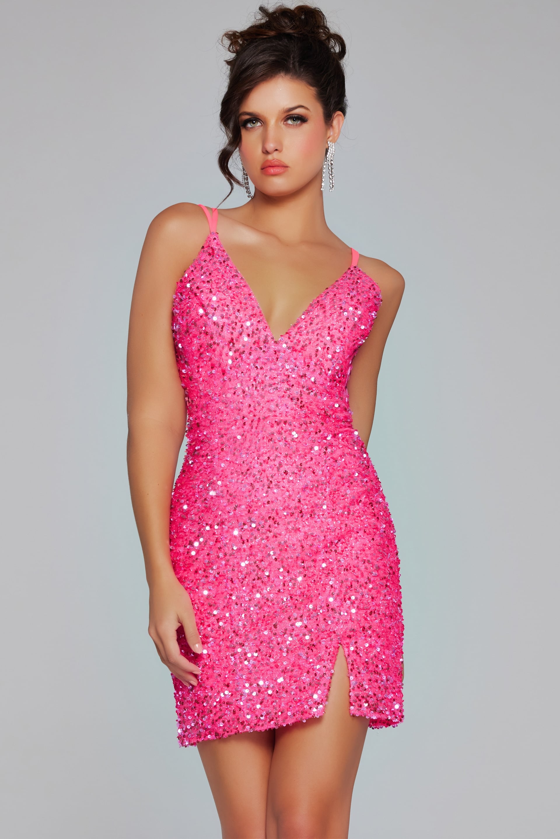Make a bold statement in this Sequin Short V-Neck Dress with Lace-Up Back. This stunning dress features a vibrant hot pink color that is sure to turn heads. The sleeveless design and V-neckline add a touch of elegance, while the high slit detail adds a hint of allure. The dress is fitted and falls to a short length, perfect for showcasing your legs. Crafted from sequin fabric, it catches the light beautifully, making you dazzle from every angle. The lace-up back style not only provides a perfect fit but also adds an intricate design element. Ideal for parties, dances, or any special occasion where you want to shine.
