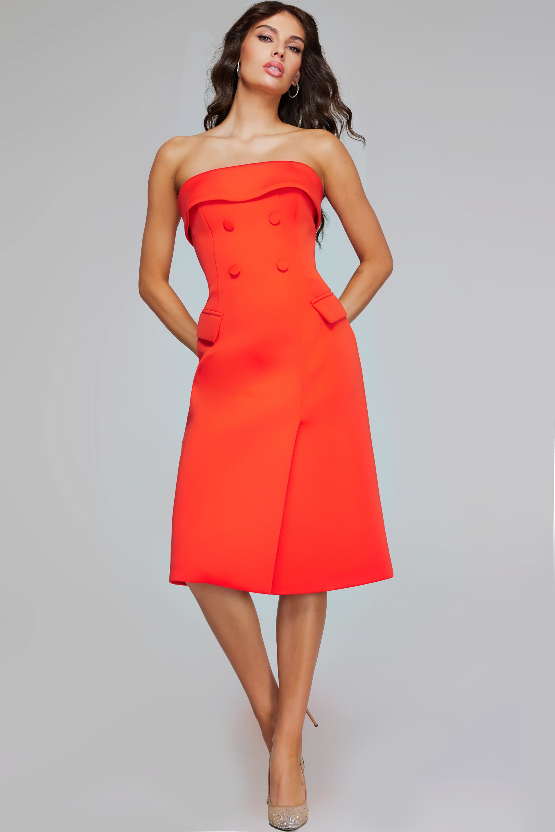 Elevate your style with this beautiful strapless satin sheath dress. Featuring a stunning orange hue, this dress is designed with a simple silhouette and a midi length to provide a sophisticated and timeless look. Crafted from high-quality satin fabric, the dress exudes elegance and comfort. Perfect for any formal occasion, this dress ensures you stand out with its clean lines and refined appearance.