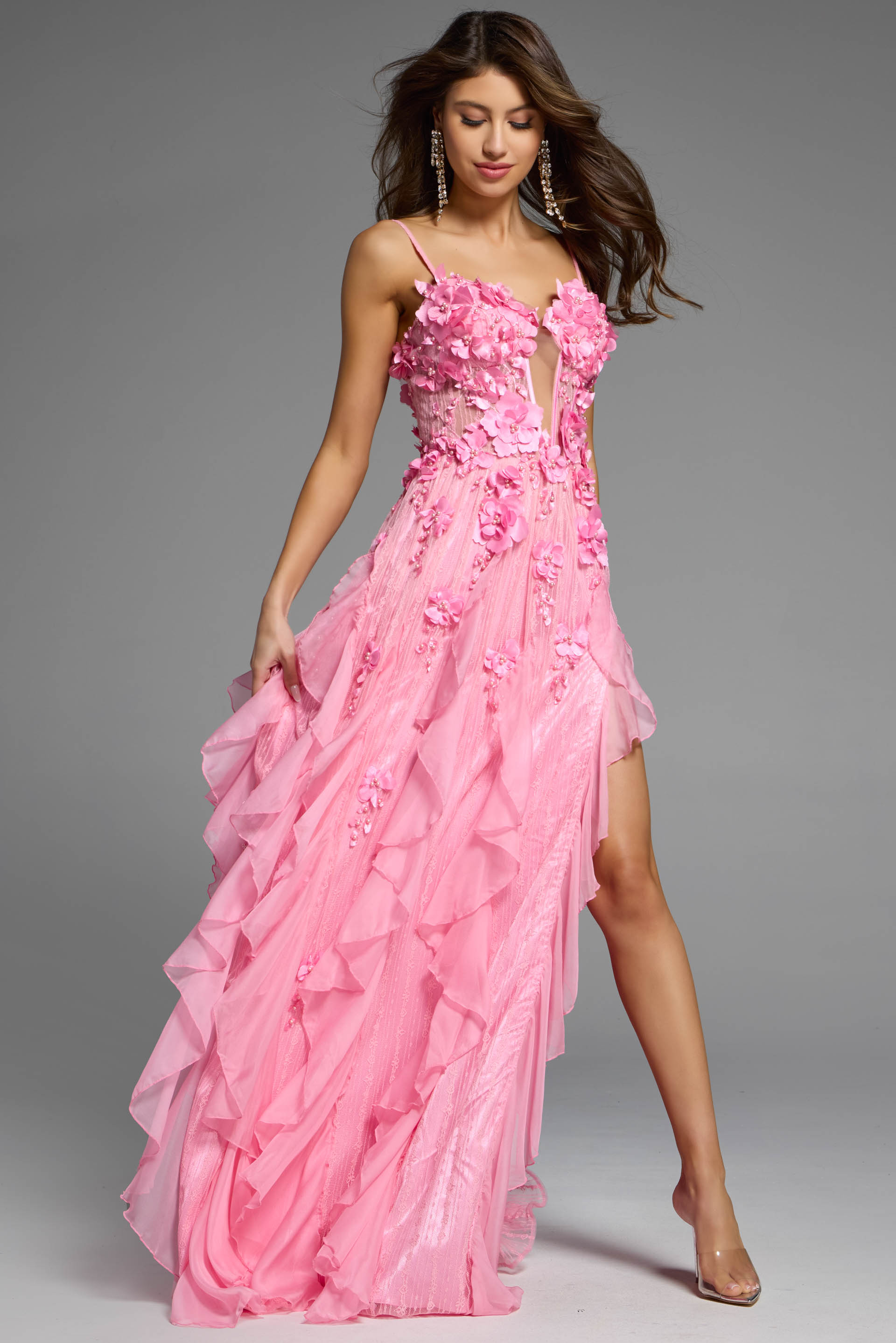 This gorgeous gown in pink captivates with its fitted bodice adorned with delicate 3D floral appliques. The dress features a plunging V-neckline that adds a daring yet elegant touch, while the floor-length skirt cascades into layered ruffles for a romantic flair. The sleeveless design enhances its chic appearance, and a high slit offers a glimpse of allure, perfect for any formal event.