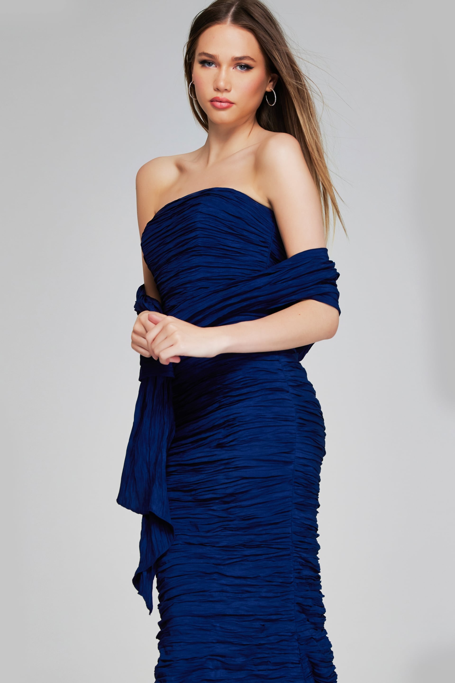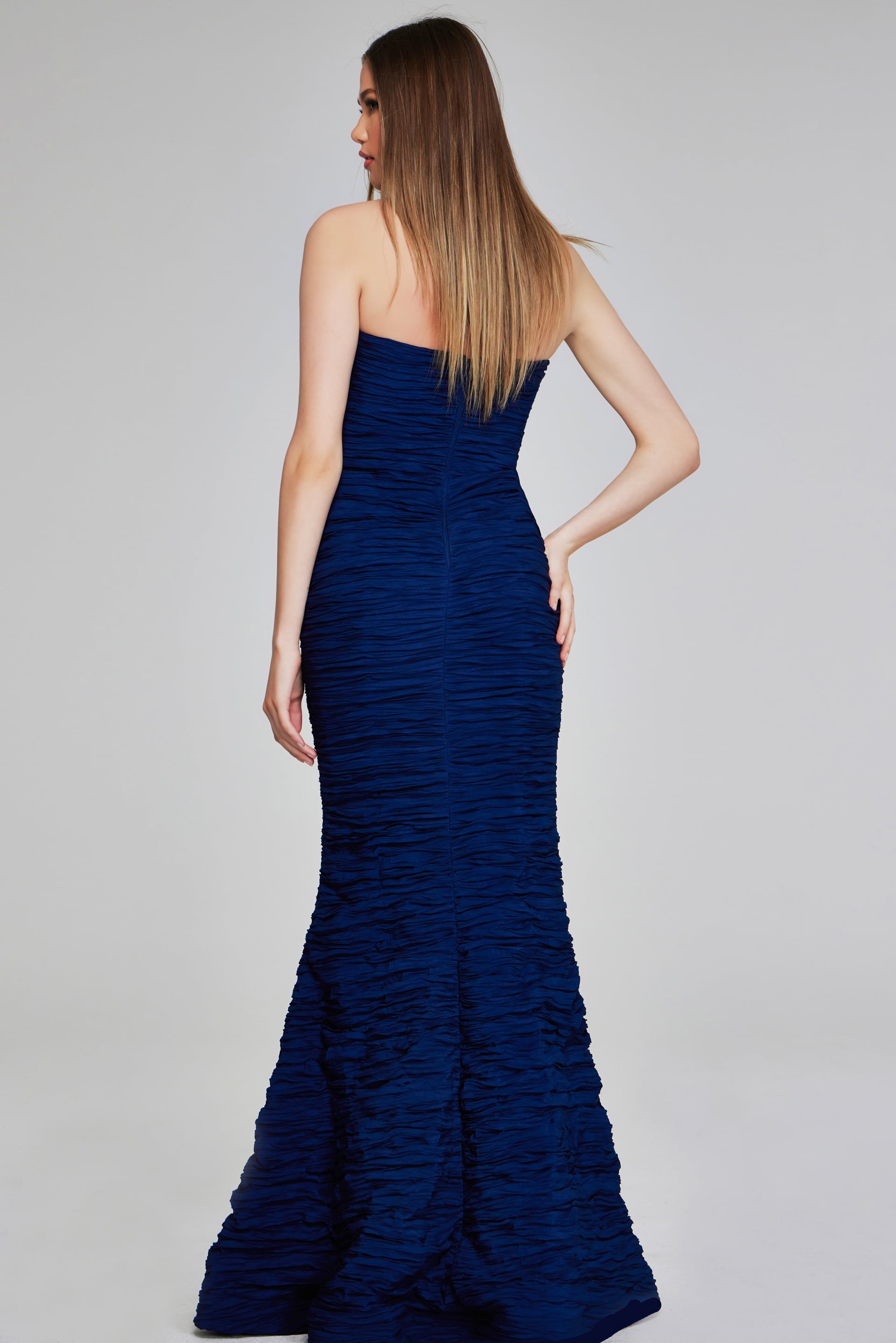 Elegantly ruched in navy, this strapless mermaid gown makes a dramatic entrance. The floor-length design is accentuated with ruffles, creating a texture-rich silhouette that flares at the knee. Made from delicate chiffon, the gown is sleeveless and completed with a closed back style. Ideal for evening receptions and formal occasions, this gown exudes sophistication and poise.