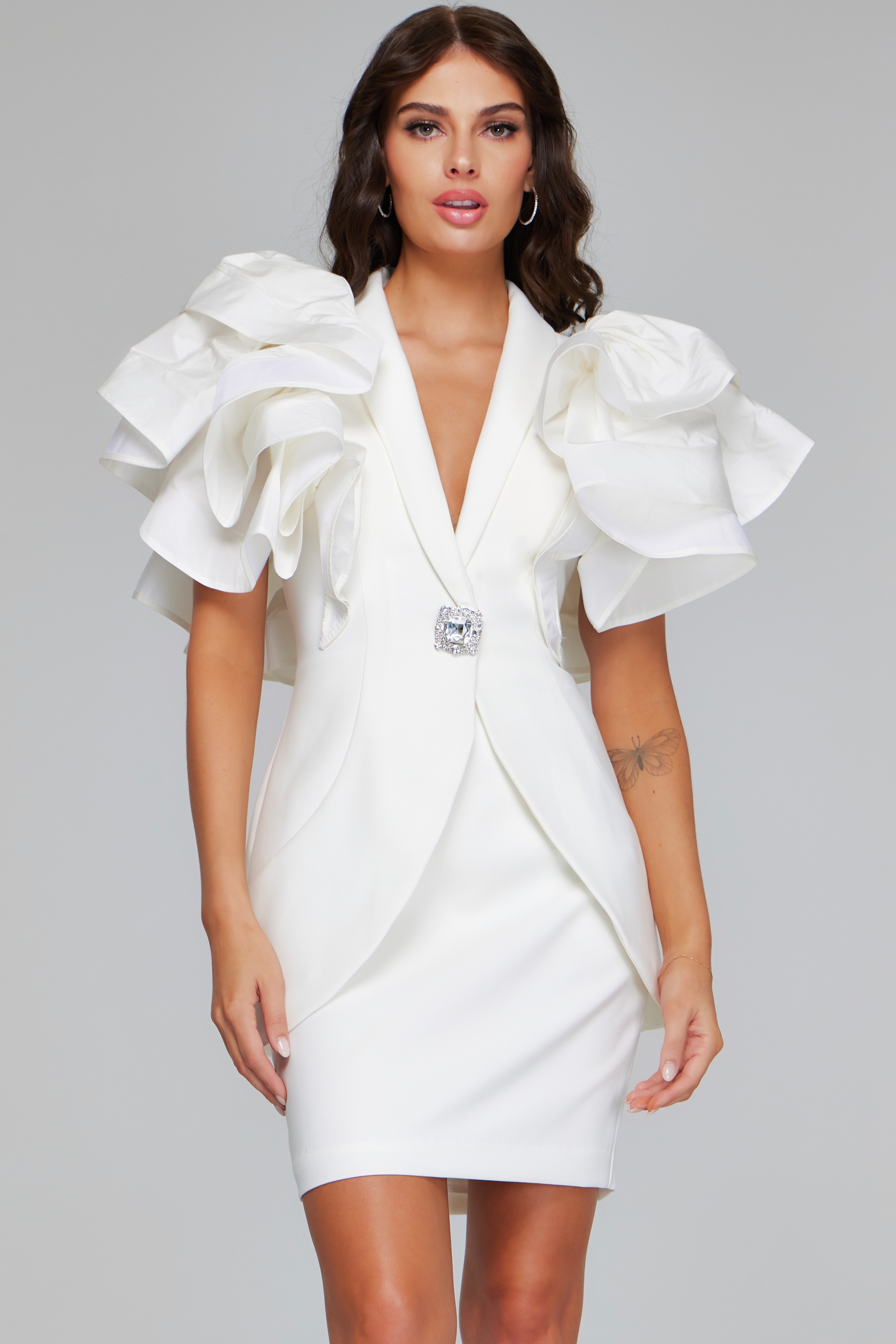 This stunning dress features a chic short length, making it perfect for formal or semi-formal occasions. Crafted from luxurious Taffeta fabric, this dress boasts voluminous ruffle sleeves that add a touch of drama and sophistication to your look. The deep V-neckline creates an elegant yet daring silhouette, making a bold fashion statement. Available in a pristine ivory color, this dress combines classic elegance with contemporary style, ensuring you’ll stand out at any event.