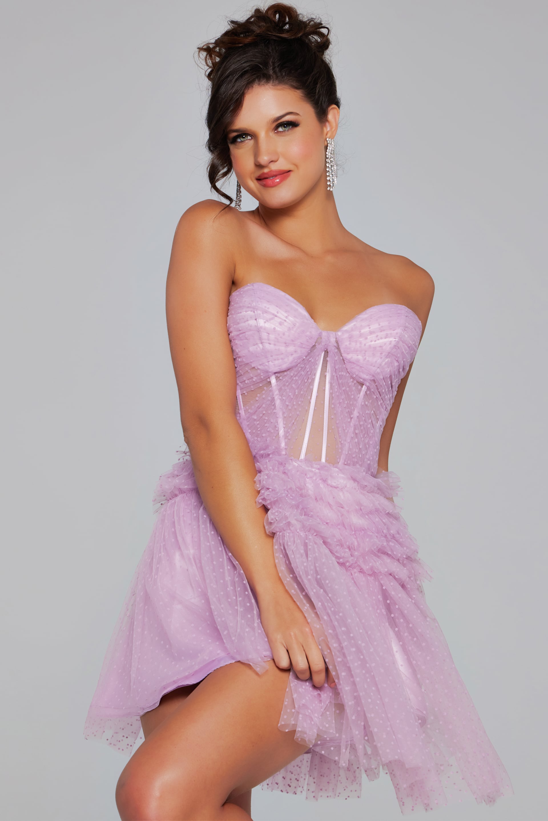 This enchanting short dress features a strapless sweetheart neckline and a whimsical tulle fabric adorned with subtle polka dot details. The fitted bodice and ruffled tiers at the waist create an ethereal A-line silhouette, perfect for making a statement at any special event. The dress also features an open back style for an added touch of allure.