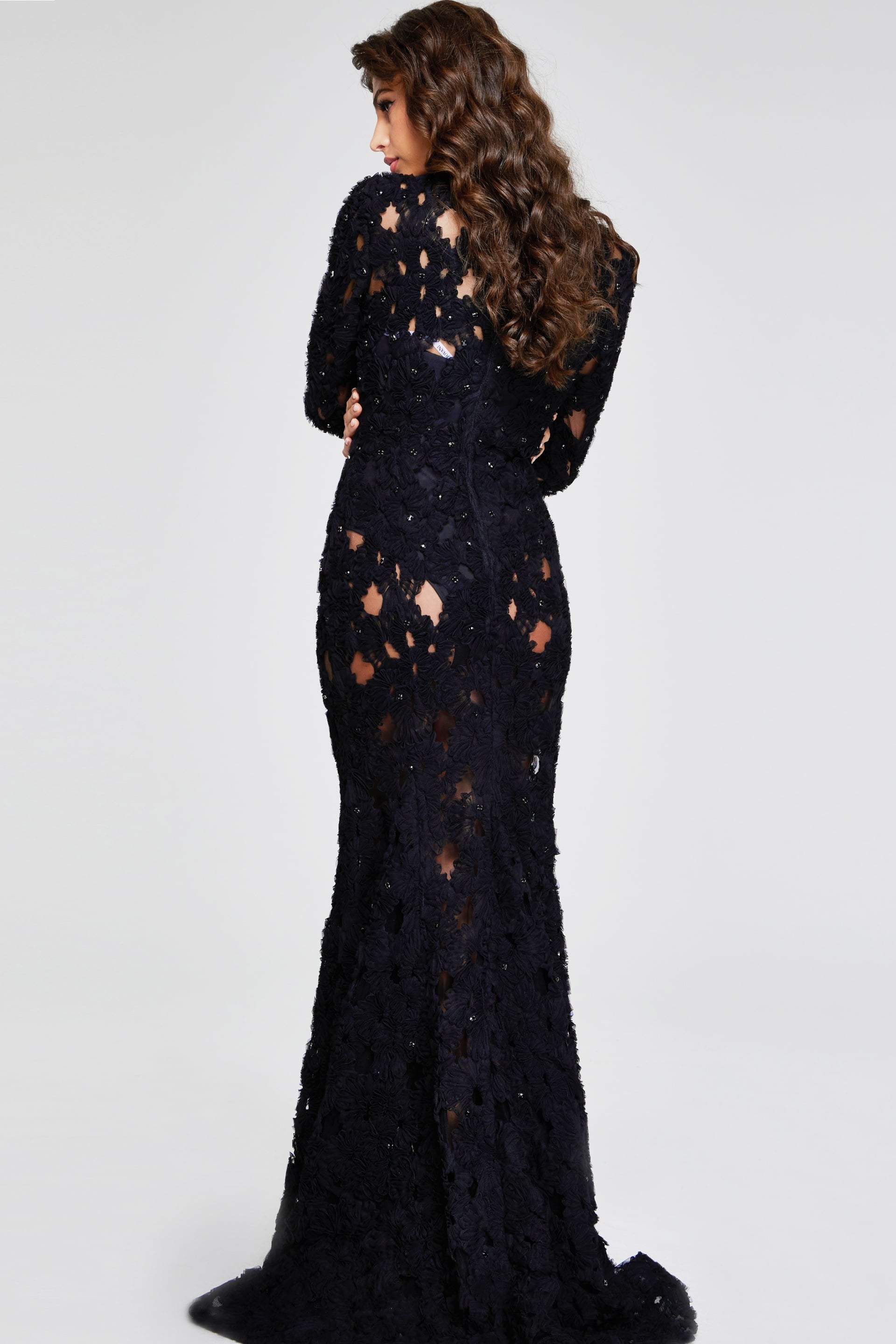 Make a statement in this elegant mermaid gown featuring a sheer design adorned with intricate rosettes. It boasts long sleeves, a fitted bodice, and a sophisticated floor-length mermaid silhouette that flares beautifully at the knee. This dress is perfect for glamorous events where you need to shine.