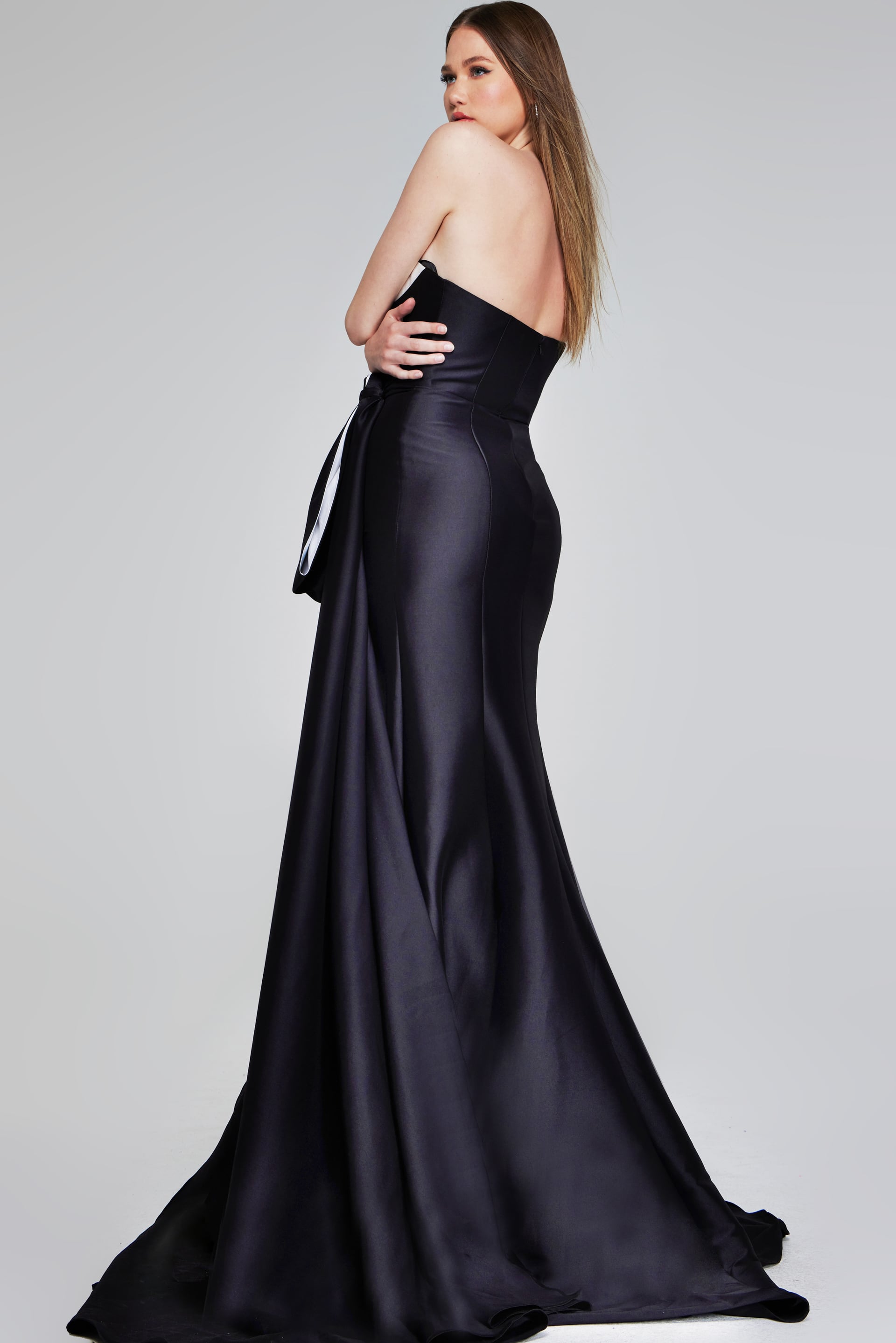 This stunning floor-length evening gown in black features a fitted silhouette that elegantly flares out at the base. The strapless design showcases a striking V-notched neckline that adds a modern touch to this classic piece. A dramatic high slit creates a daring look, accentuated by a large, elegant bow detail at the waist. The smooth, flowing skirt adds a touch of sophistication, ensuring an unforgettable entrance wherever you go.