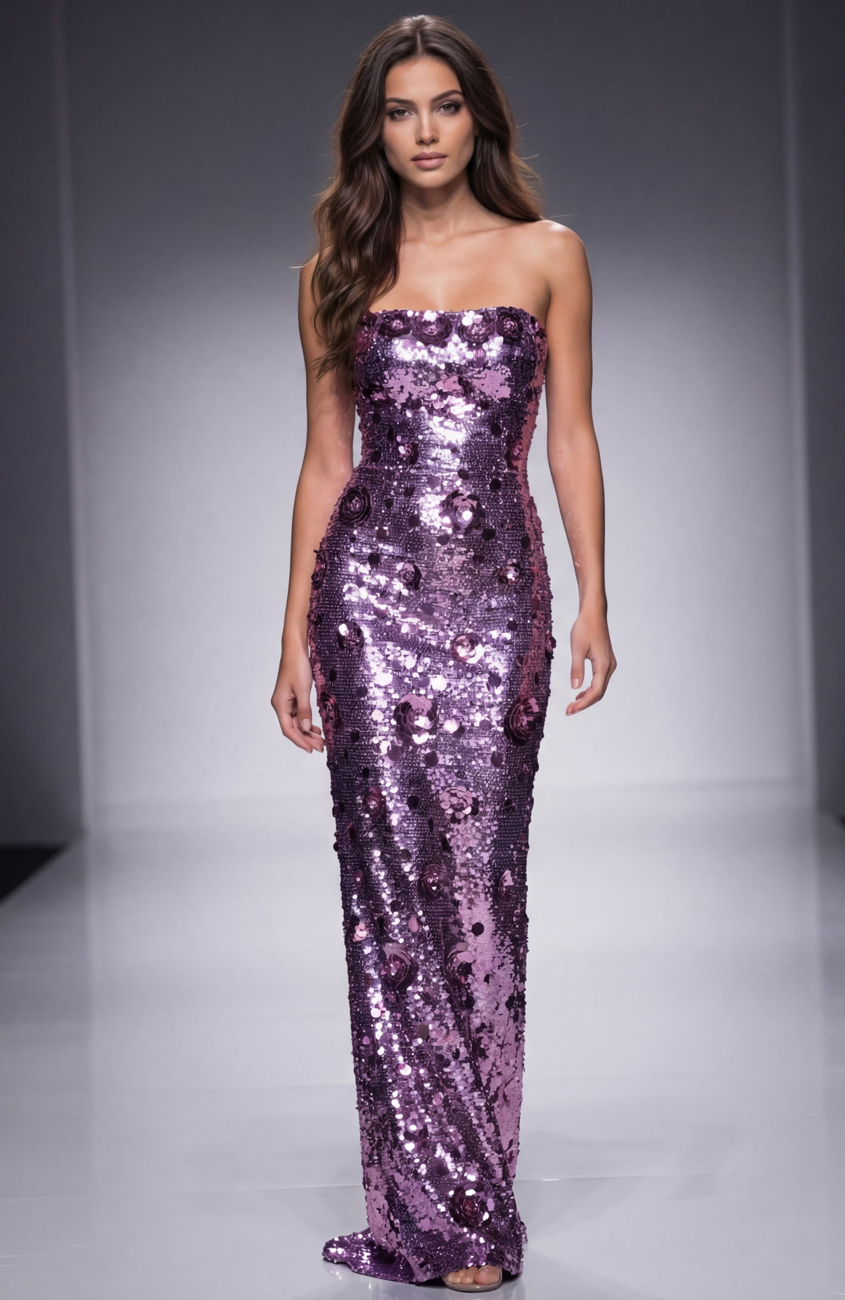 This stunning strapless mermaid gown in a vibrant lilac color is adorned with shimmering sequins from top to bottom. The fitted bodice and flared hem create a timeless silhouette. Ideal for making a stunning entrance at any formal event, this gown boasts a high slit and a seductive open back. The floor-length design and sweetheart neckline complete the look for a dazzling appearance.