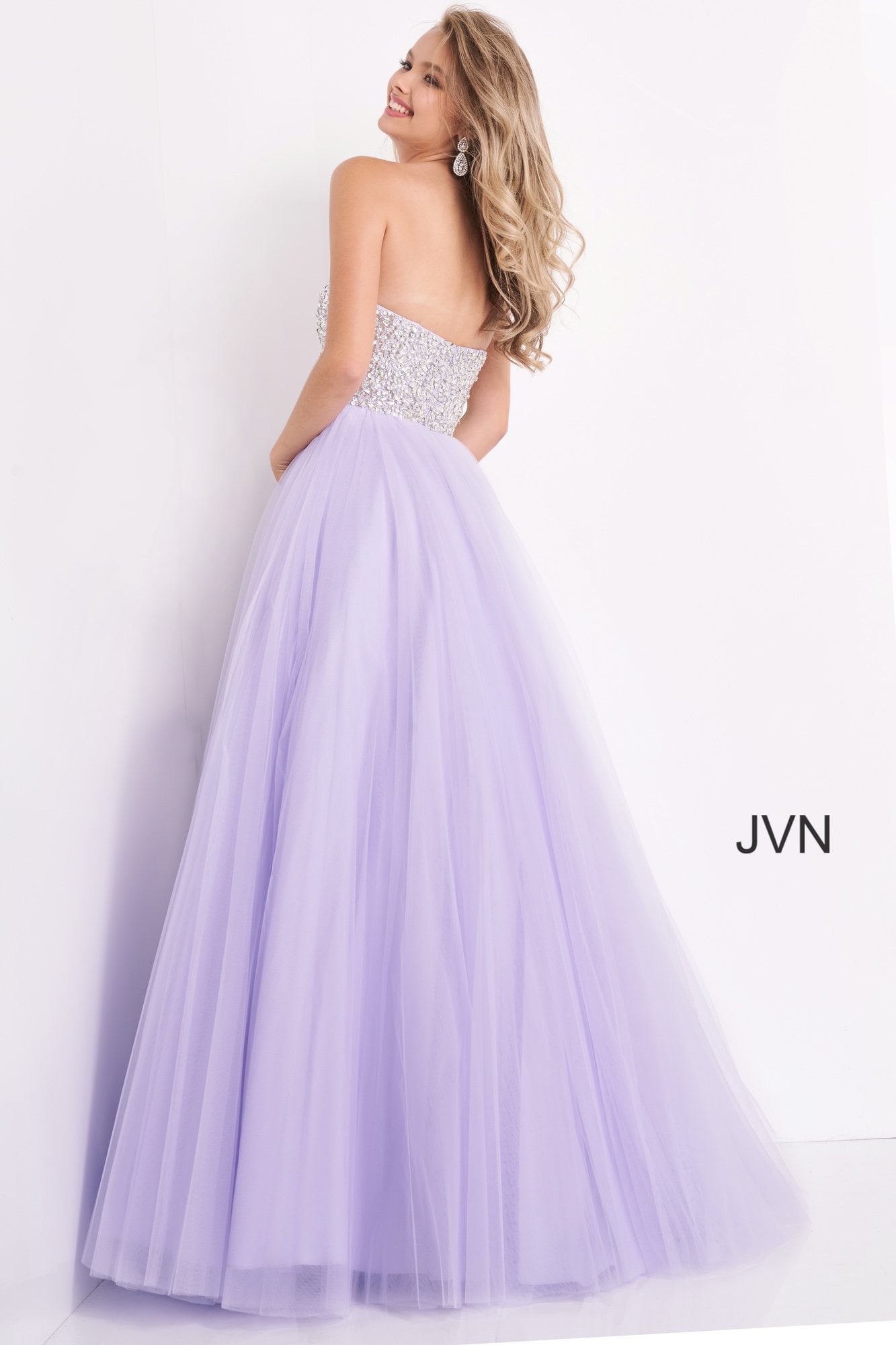 This elegant floor-length gown features a full skirt and a fitted bodice adorned with sparkling embellishments. The dress has a strapless, sweetheart neckline that complements the A-line silhouette, gracefully flaring into a voluminous tulle skirt. The back mirrors the front’s glamorous design, enhancing the shimmering allure of the dress. The dress is perfect for special occasions, exuding timeless elegance and charm.