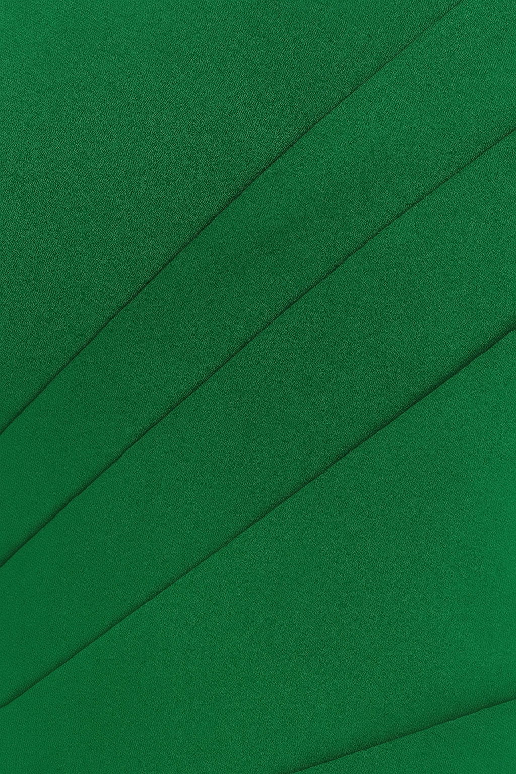 This elegant cocktail dress features a chic asymmetrical neckline, beautifully draping into a one-shoulder design. The garment showcases a dramatic puff sleeve on one side, creating a striking contrast and giving a modern twist to a classic silhouette. Designed to be knee-length, it is perfect for making a statement at any special occasion. The form-fitting silhouette wraps gently around the body, emphasizing curves with a sophisticated touch. Pleating details add depth and texture, enhancing its luxurious appeal.