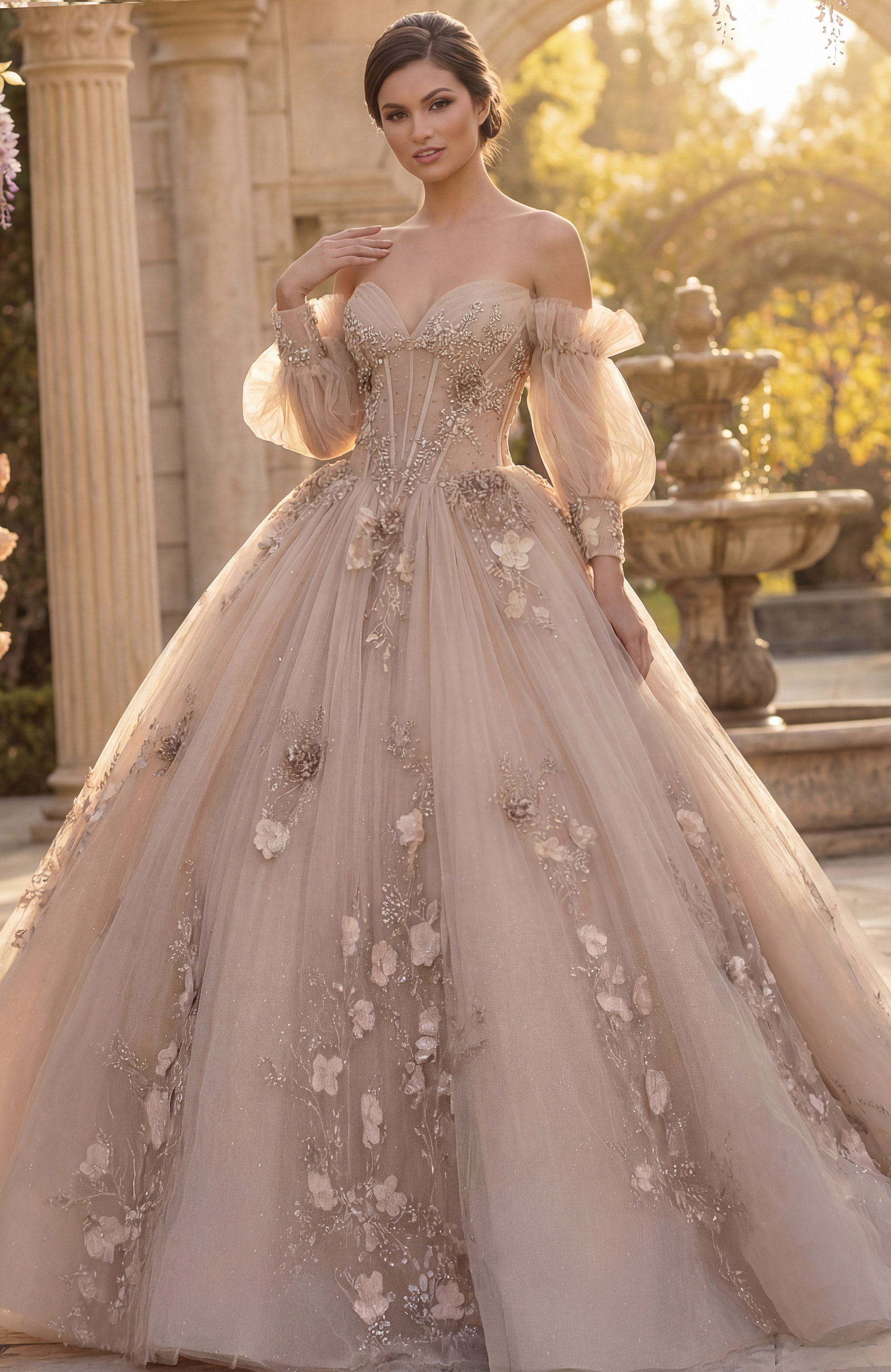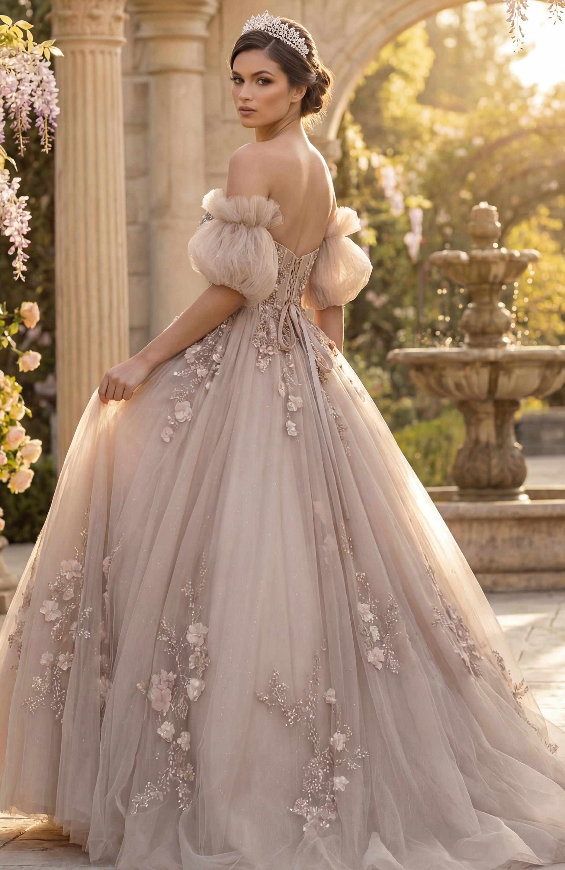 3D Flowers, Beaded Appliqués, Layered Skirt, Lace-Up Back, Off Shoulder Puff Sleeves