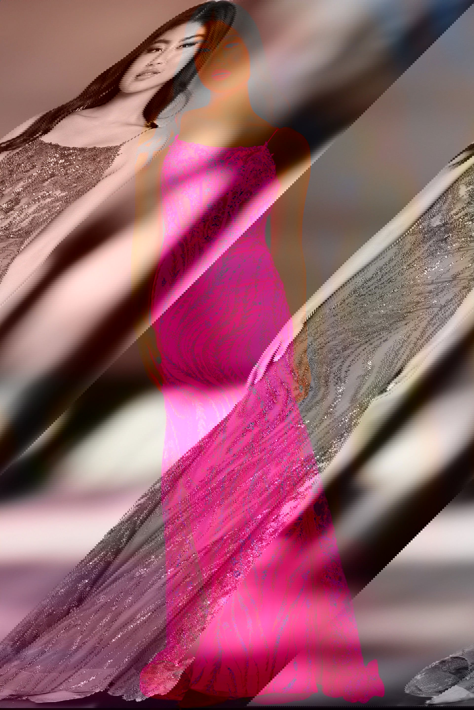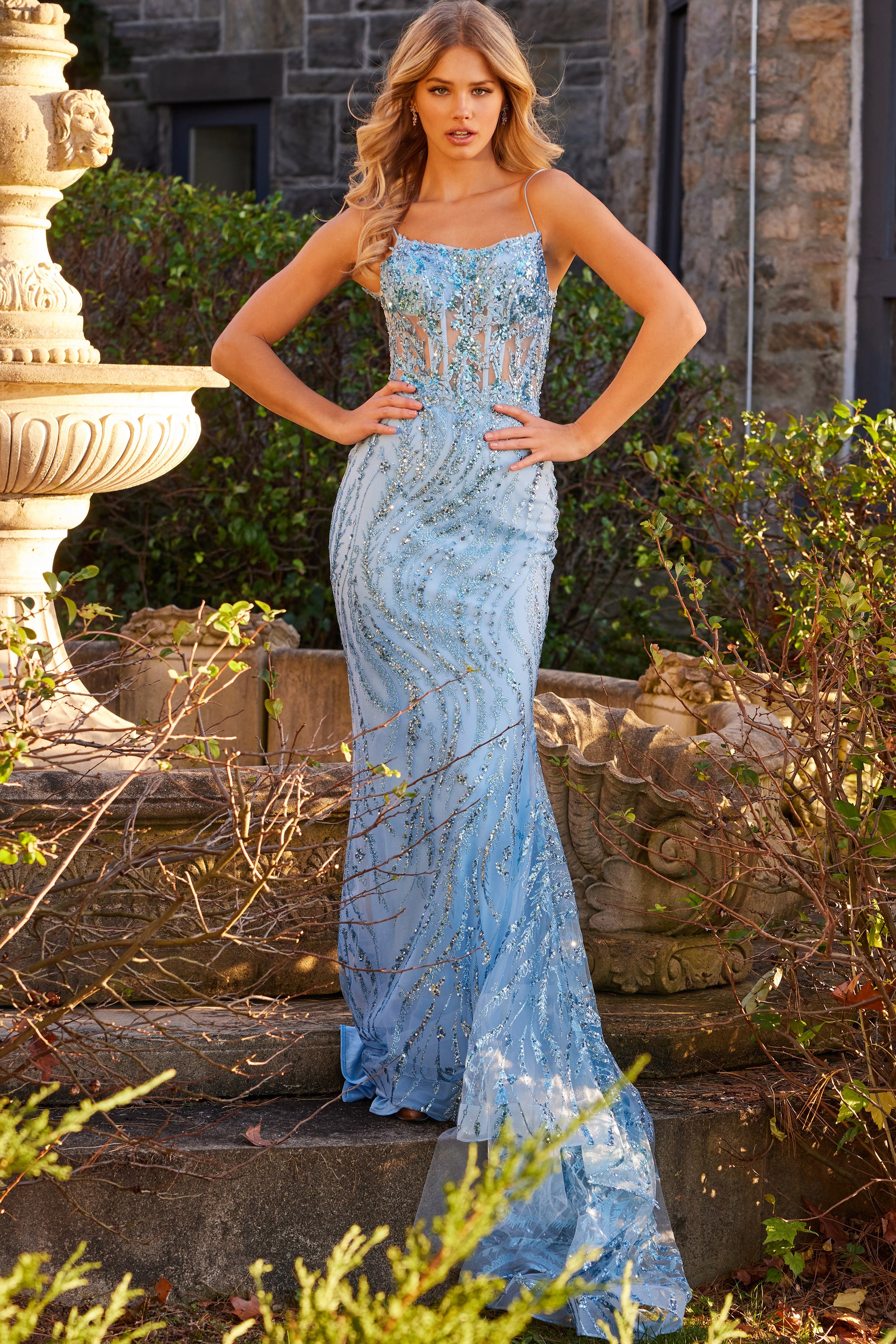 Stand out in this dazzling Mermaid Sequin Beaded Gown featuring a sheer bodice adorned with intricate beading and sequins. The gown comes in various stunning colors such as light blue, lavender, and hot pink. The floor-length silhouette ensures a dramatic entrance, while the sleeveless design and tasteful spaghetti straps provide a touch of elegance.