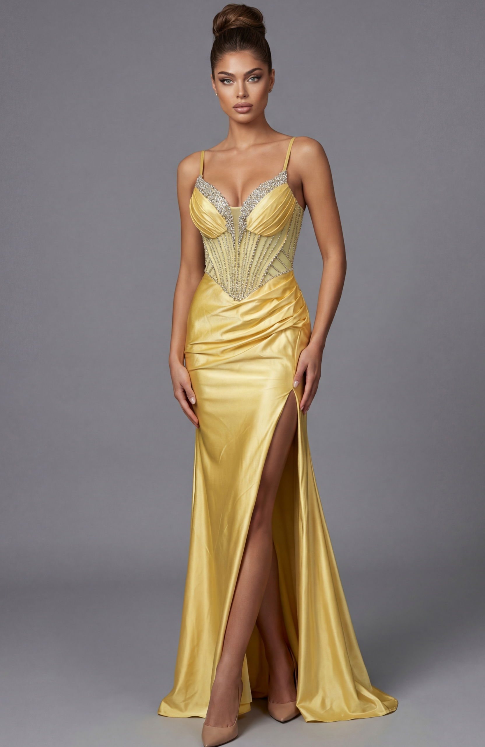 Draped bodice, sheer corset with beaded embellishments, high slit, ruched waist detail, sweep train