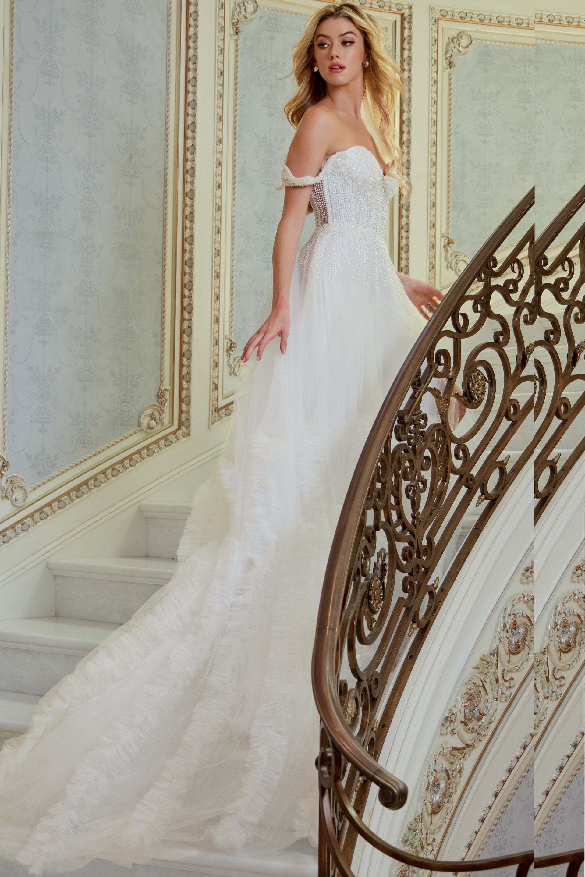 Beaded bodice, sheer corset, off-the-shoulder straps, layered ruffle skirt, cathedral train