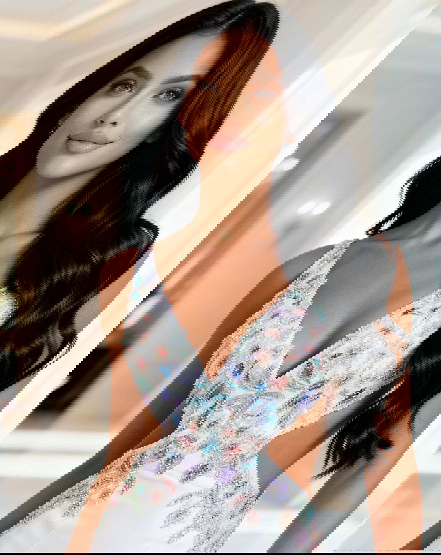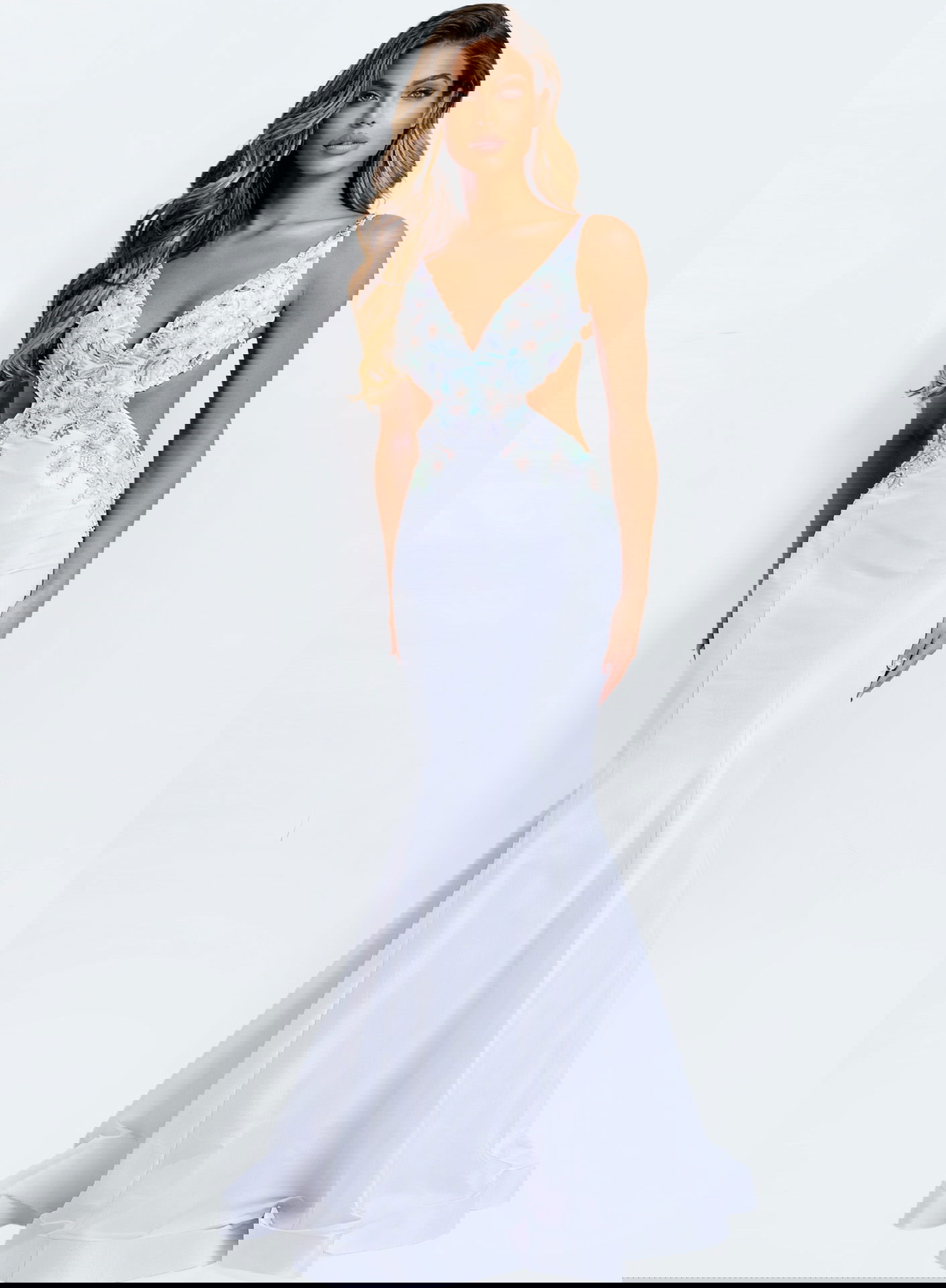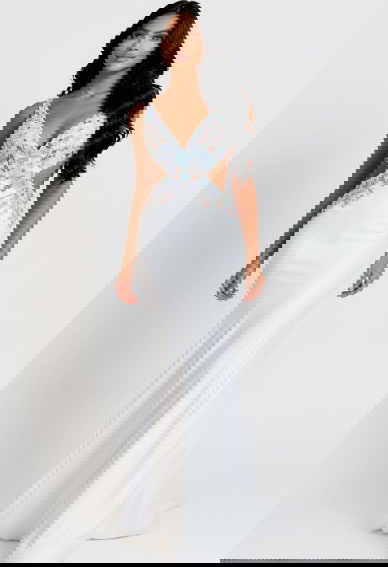 Multicolor Beading, Cutout Sides, Train with Floral Embroidery, Fitted Bodice, Smooth Skirt