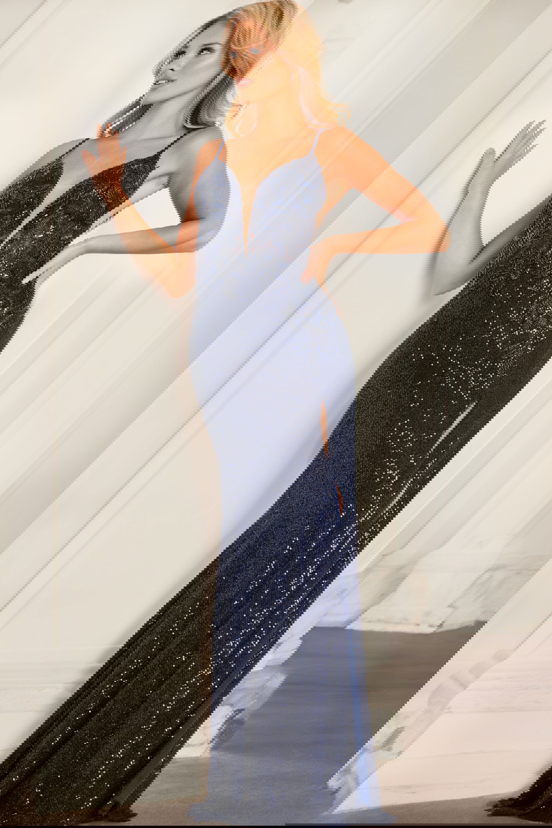 This stunning navy sequin beaded mermaid gown is a perfect blend of elegance and allure. Crafted from sequined fabric with intricate beaded details, this gown features a floor-length silhouette that hugs the body down to the hips before flaring out dramatically at the knees. The V-neckline adds a touch of sophistication while the sleeveless design ensures a sleek finish. Additionally, the high slit detail brings an edge of modernity to this timeless piece. Ideal for formal events or special occasions, this gown guarantees to make a statement.