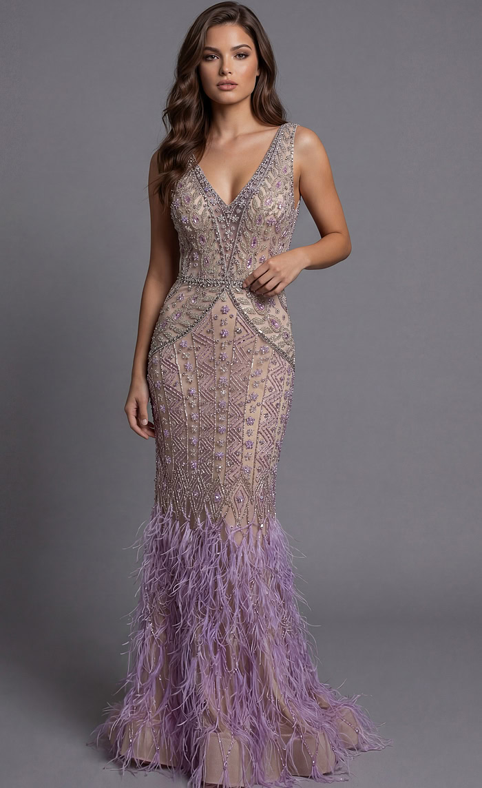 Allover Beading, Geometric Pattern, Sheer Illusion Paneling, Feather Hemline