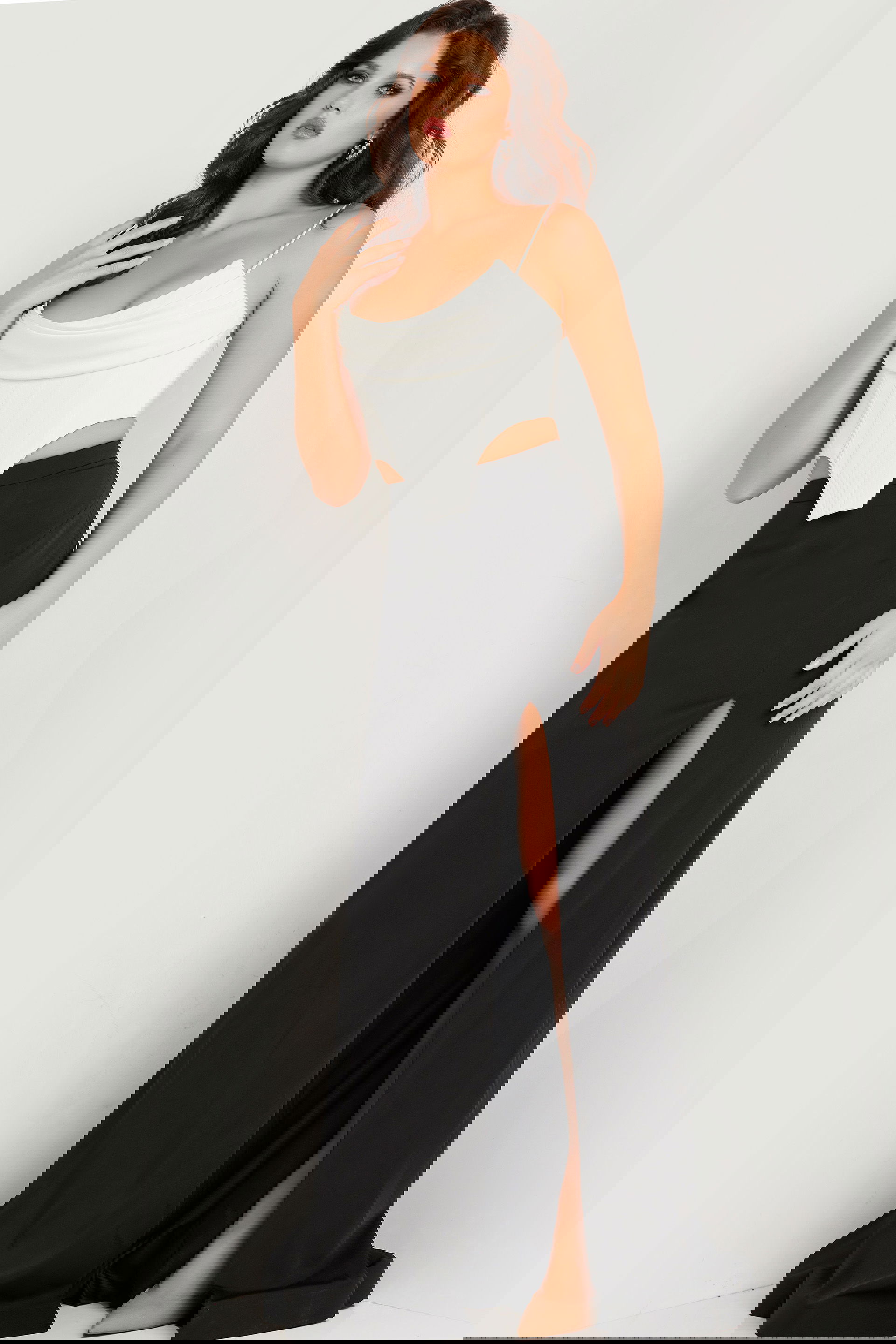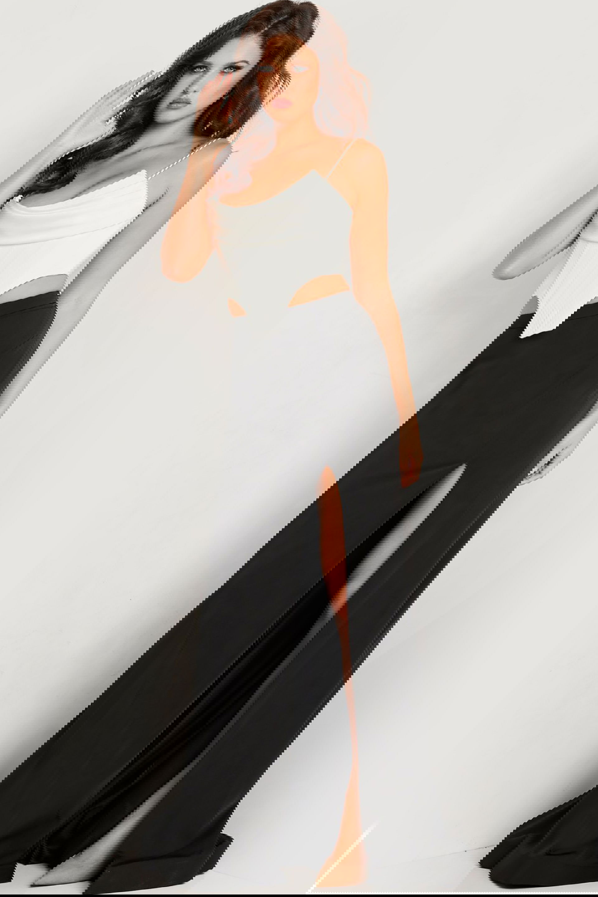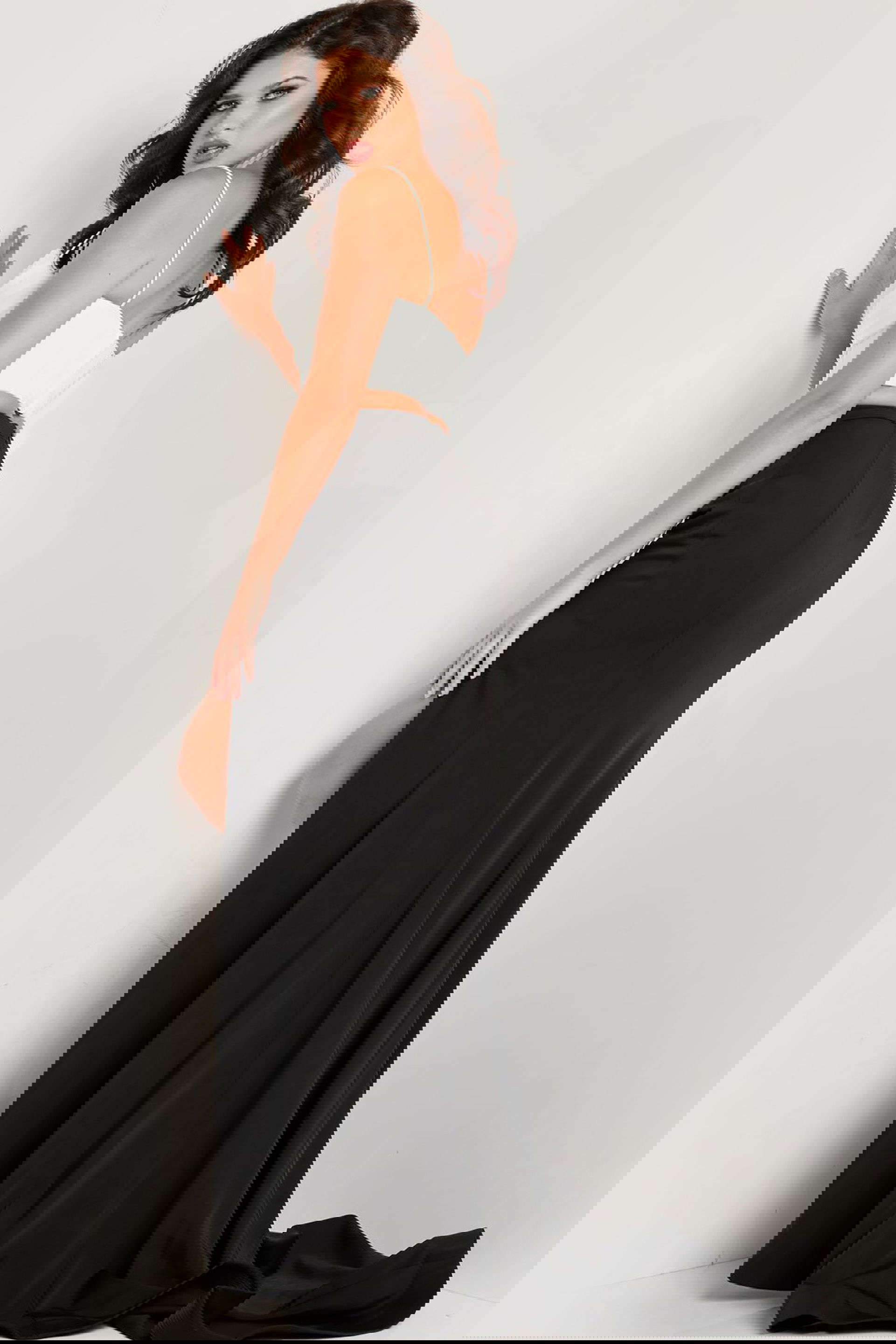 The gown is adorned with a high slit, creating a dramatic and alluring effect, and a train that adds a sense of elegance and sophistication. The pleated bust adds texture and visual interest, contributing to the overall modern and chic design.