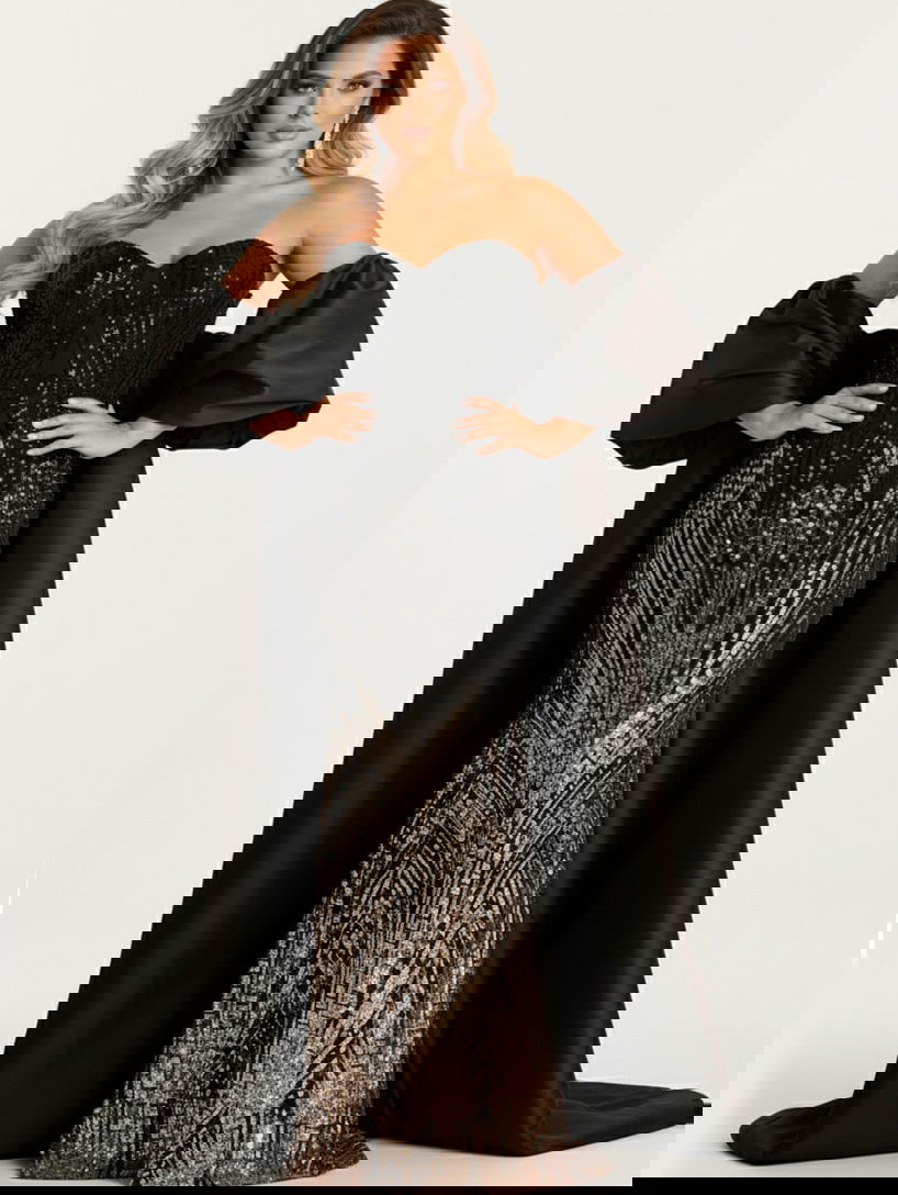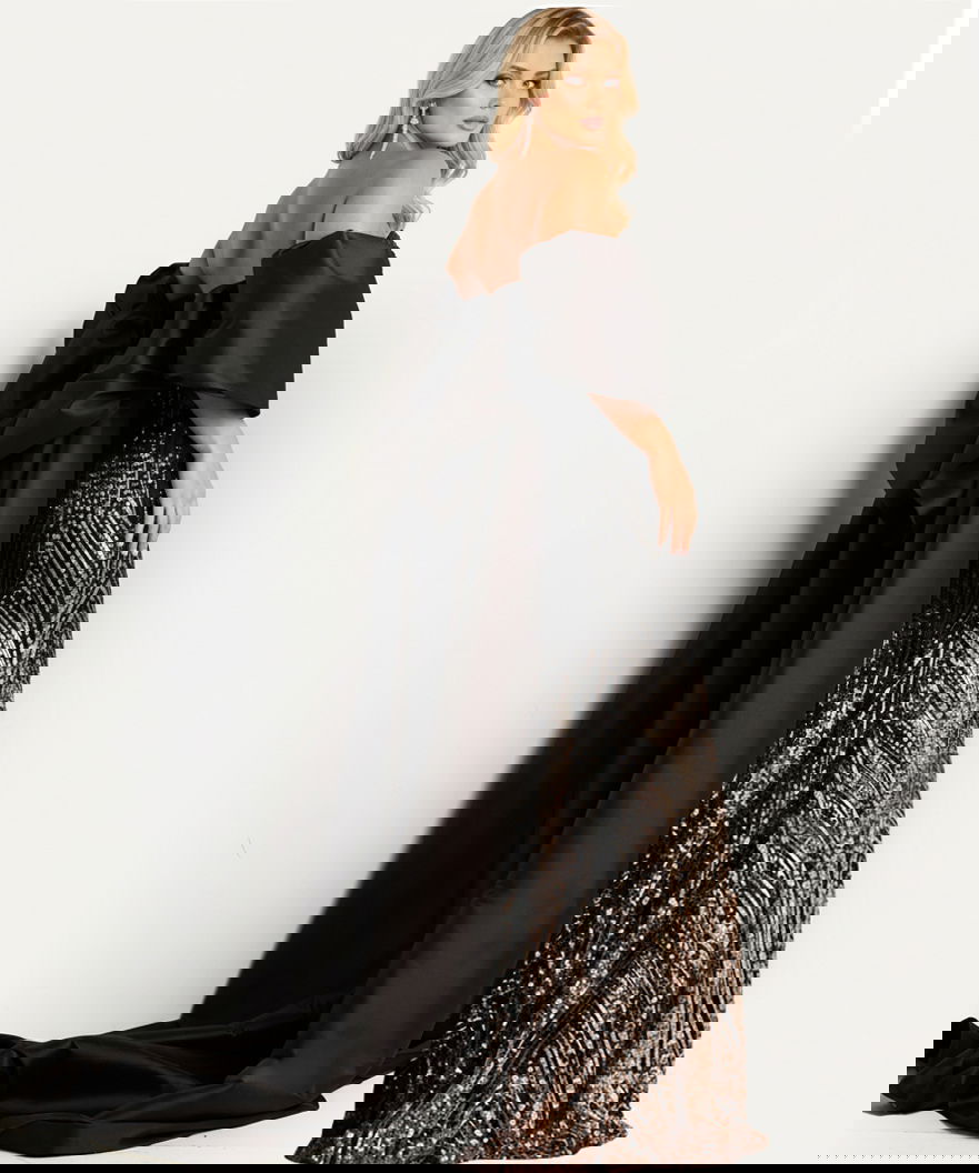 Available in a striking combination of black and brown, this unique color choice adds drama and intrigue, making the dress stand out in any crowd.