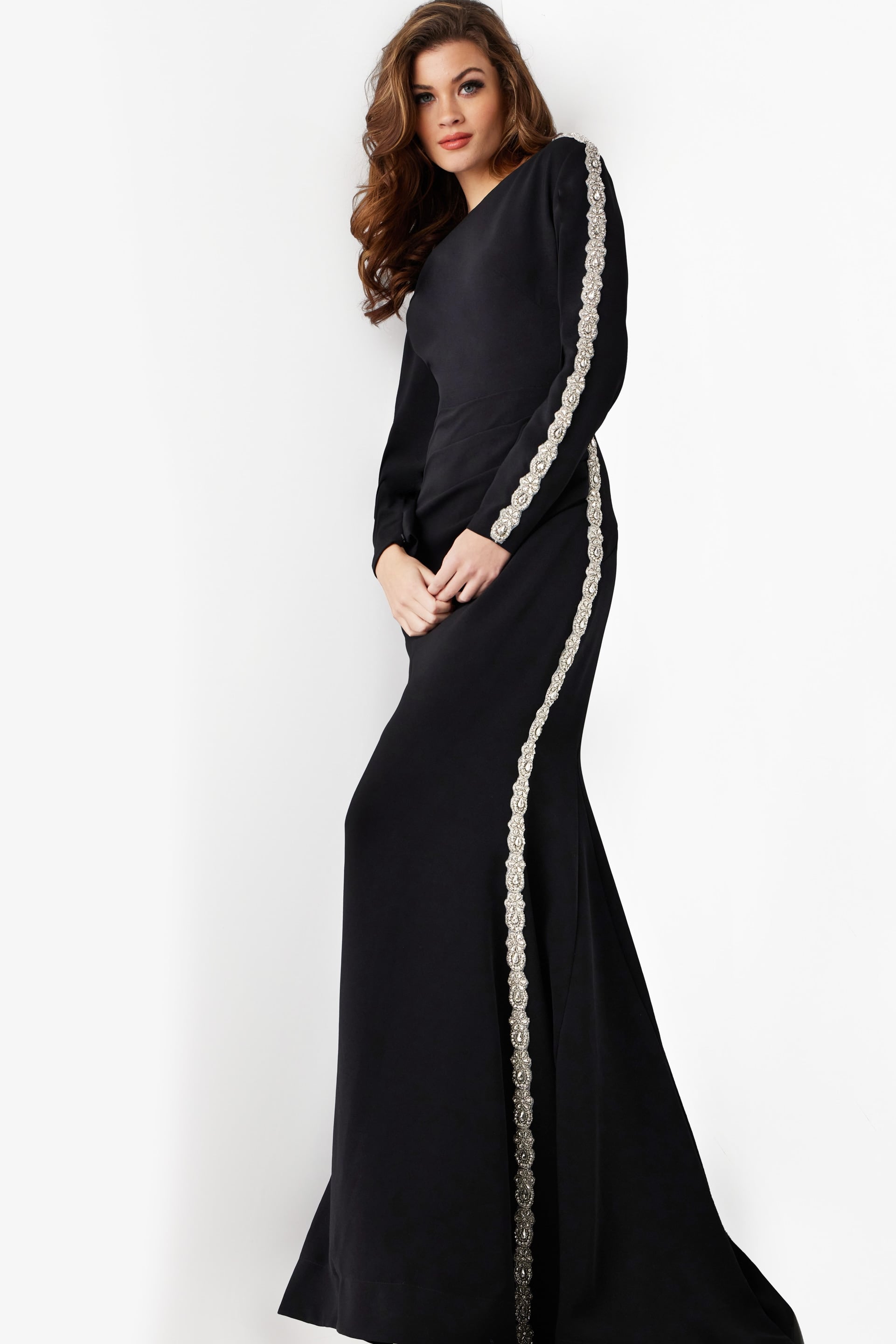 The Jovani 24191 evening dress is an exquisite piece designed for elegant occasions such as black-tie events or weddings. Crafted from luxurious crepe material, this dress boasts a sophisticated sheath silhouette that accentuates the figure with grace and allure.