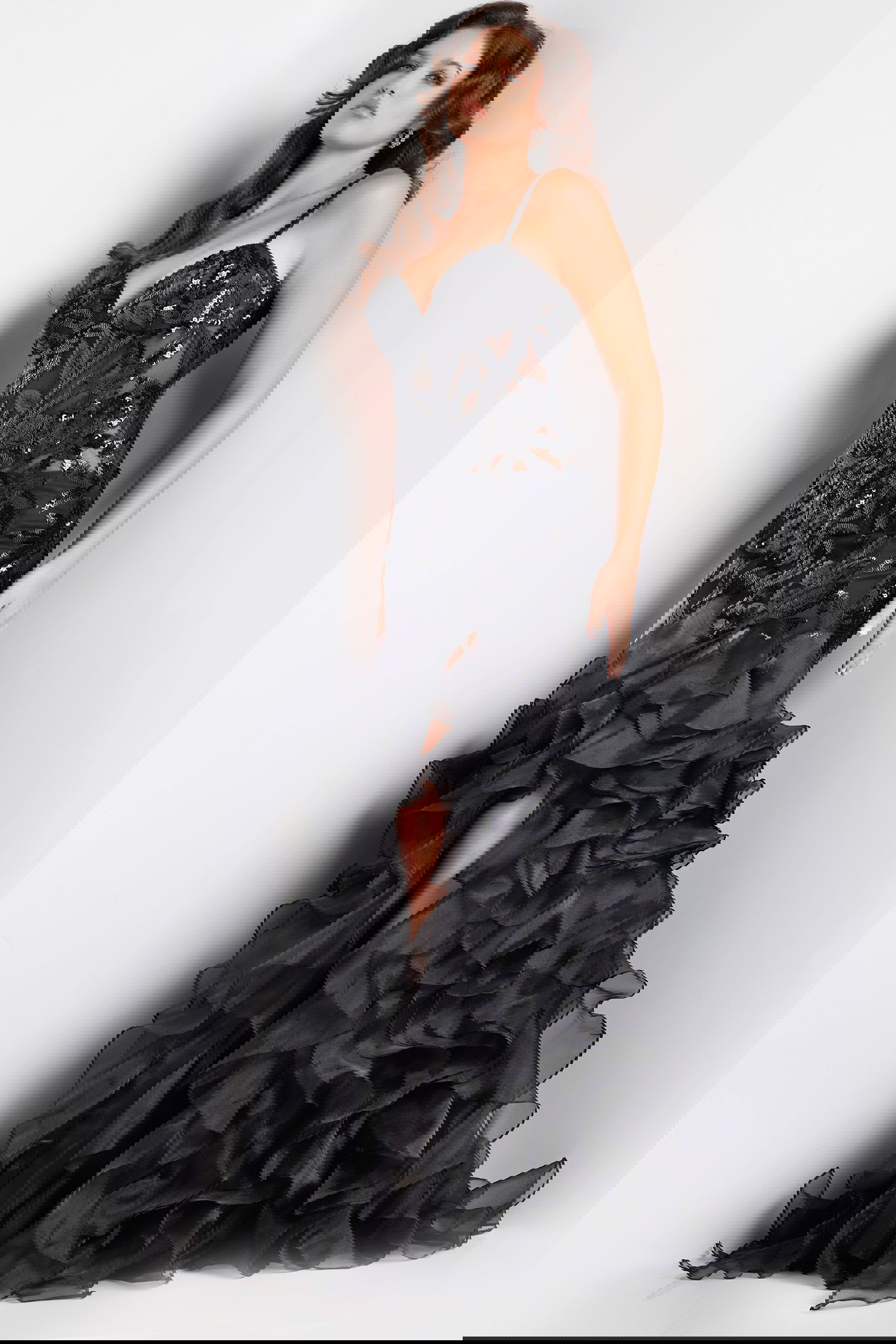 The organza ruffle skirt not only adds a sense of flair and drama but also features a slit, allowing for ease of movement and an added touch of allure. The sequin embellished bodice, with its boning and illusion waist, is designed to enhance your figure and create a captivating effect.