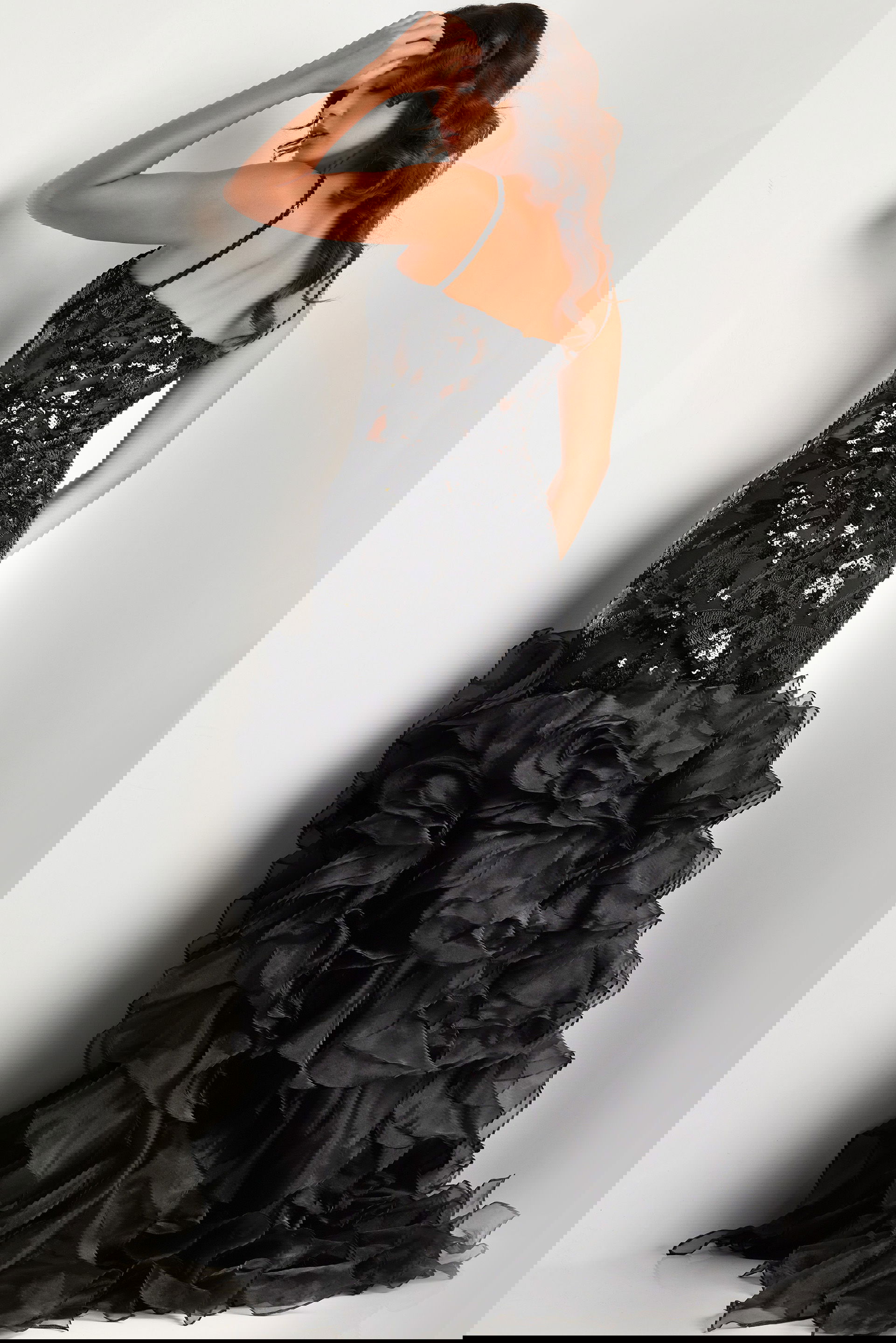 The Jovani 38358 is an elegant formal gown designed to make a statement at your special event. This beautiful dress combines tulle and organza to create a luxurious and multidimensional look. The organza ruffle skirt with a slit adds a touch of drama and movement to your overall appearance, while the sequin embellished bodice features boning and an illusion waist for a stunning and flattering silhouette.