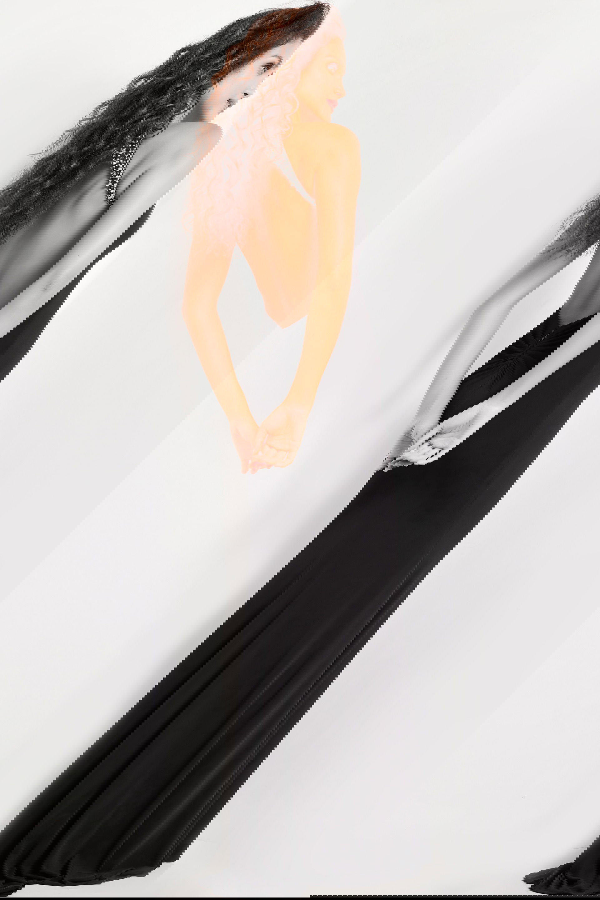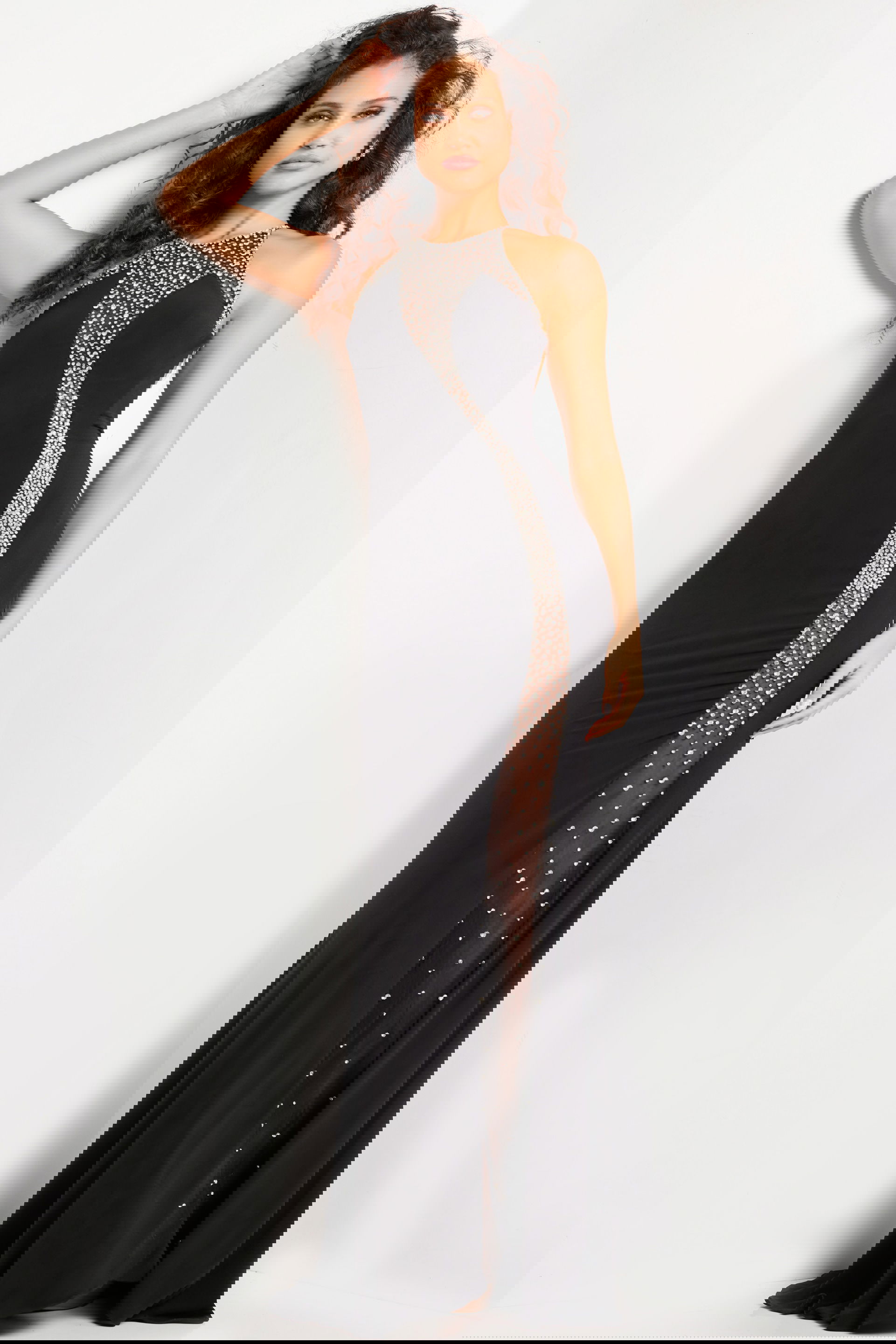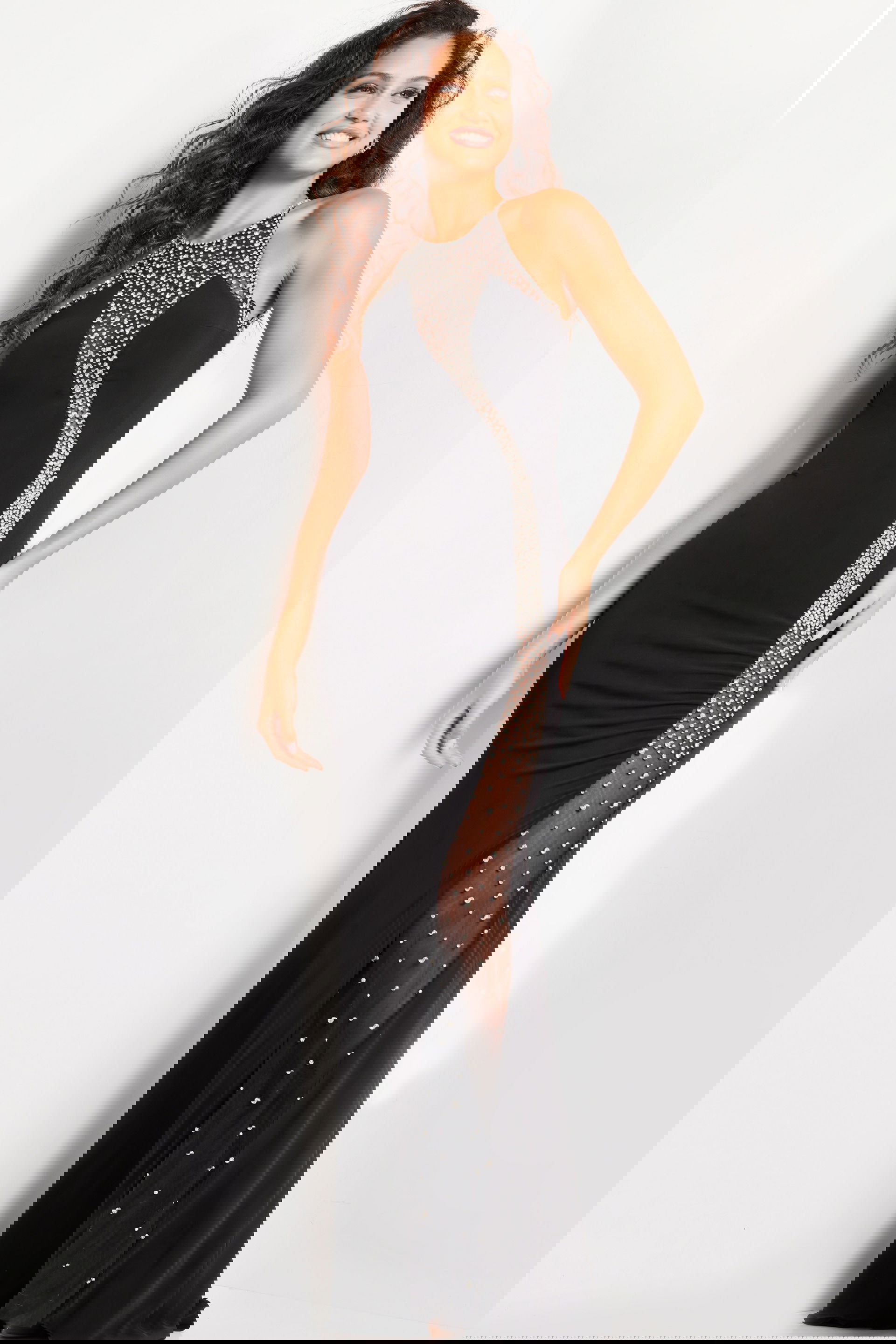 The Black Embellished Sleeveless Gown 37215 is an exquisite addition to any formal wardrobe. Designed with a floor-length silhouette, this exquisite gown features intricate beaded details that create a stunning effect on its sleek, black jersey fabric. The elegant fit and flare design accentuates your curves, while the high slit adds a touch of allure. With its sleeveless cut and sophisticated halter neckline, this gown ensures a chic and sophisticated look for any glamorous event.