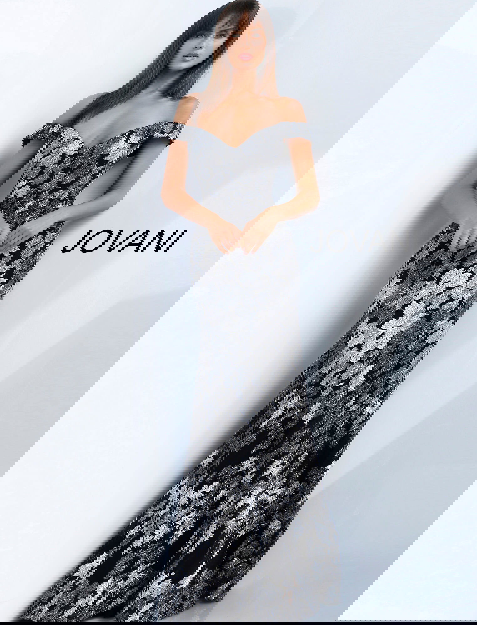 Jovani 61380 Black Grey Floral Embroidered Off the Shoulder Evening Dress. This captivating evening gown features a timeless off-the-shoulder neckline that elegantly frames the shoulders and décolletage. The exquisite floral embroidery adds a touch of nature-inspired artistry to the luxurious fabric, making it a standout choice for any formal occasion. With a mermaid silhouette that gracefully flares from the knee, this full-length dress offers a sophisticated and flattering fit. The floor-length design enhances its dramatic allure, perfect for making a grand entrance.