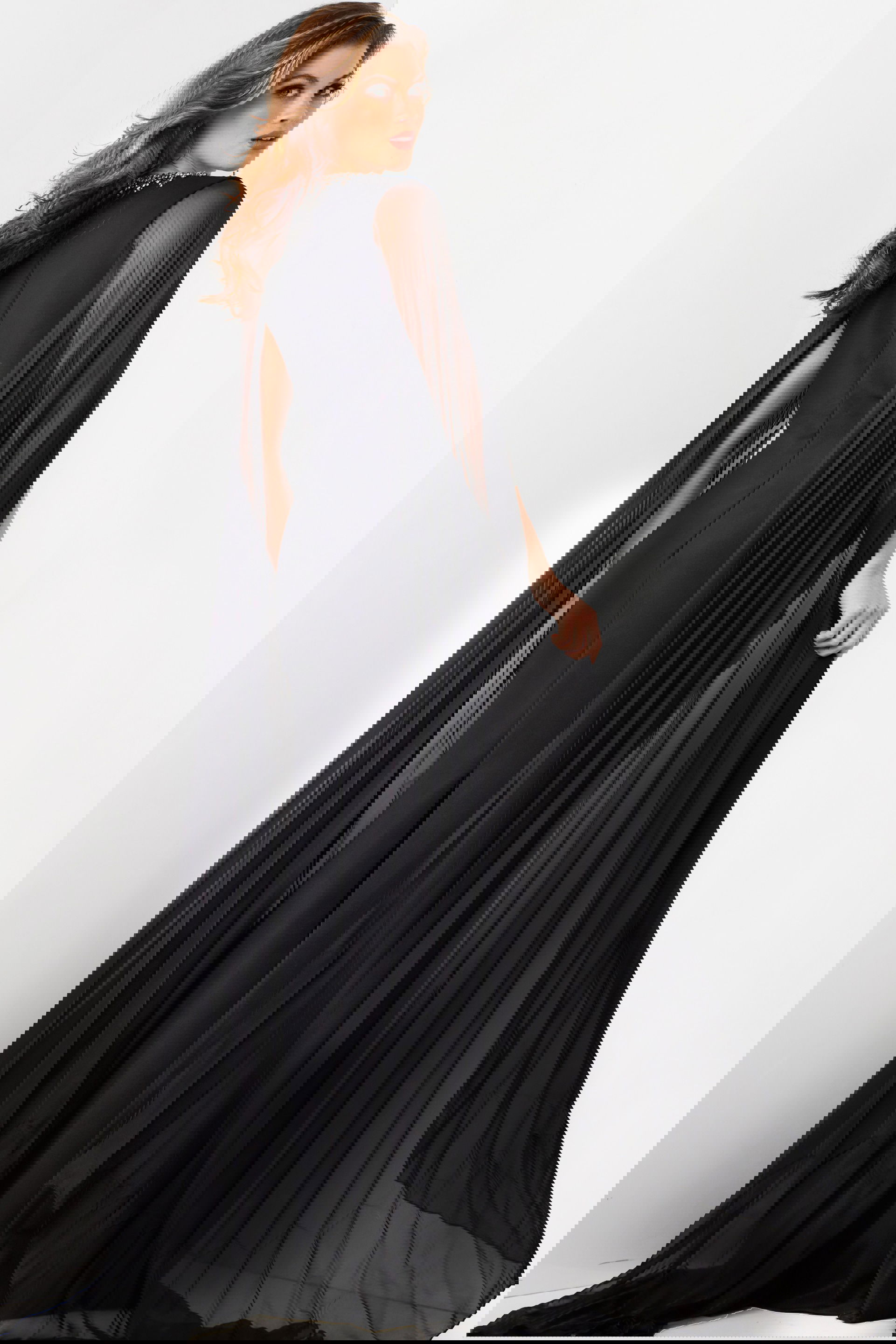 The dress boasts a low V-neckline, exuding allure and sophistication, while long floor-length cape sleeves add a dramatic flair, creating a captivating silhouette that is sure to turn heads.