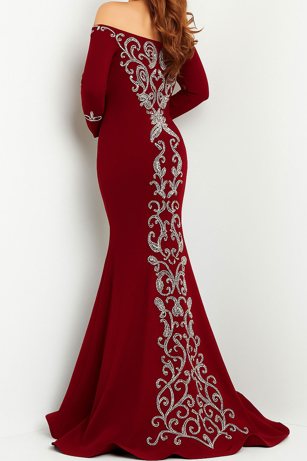 Black Mermaid off the Shoulder Dress 24328. Elevate your elegance with this stunning black mermaid dress. The dress features a glamorous off-the-shoulder neckline that gracefully highlights the shoulders. Intricately beaded details embellish the dress, creating a dazzling, ornate effect that will turn heads. The dress is crafted from soft and flowing jersey fabric, which hugs the bodice and flares beautifully at the knee, enhancing the mermaid silhouette. This floor-length beauty is ideal for formal events, exuding sophistication and style.