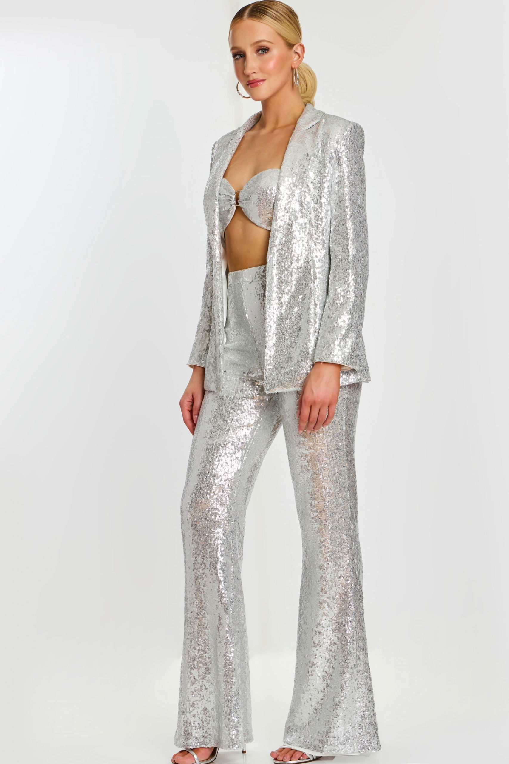 Sequin Jumpsuit with Matching Blazer. This stylish jumpsuit features an all-over sequin design that ensures you shine at any event. The jumpsuit includes a matching blazer and a cropped top, creating an effortlessly chic ensemble. Perfect for glamorous outings or festive occasions.