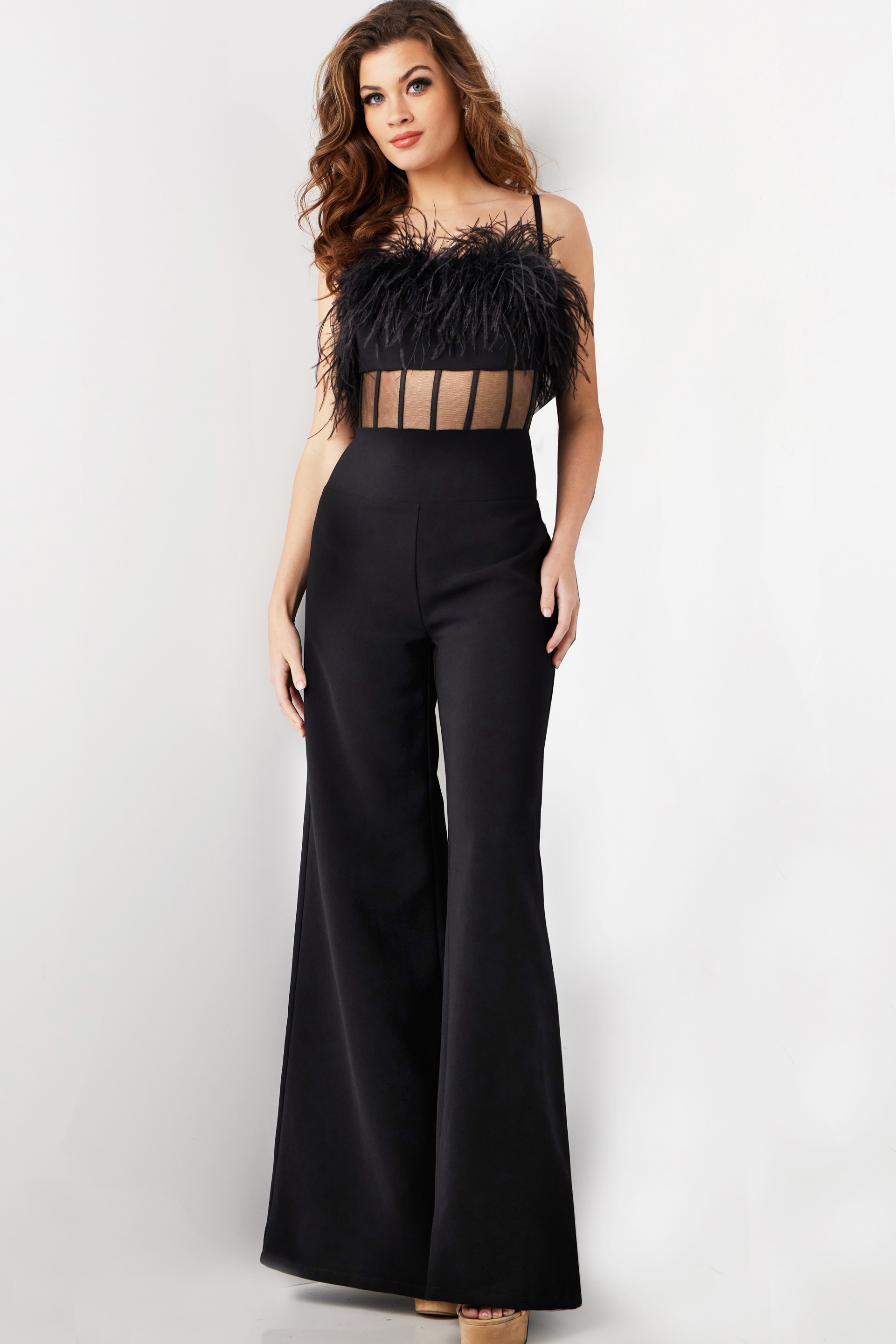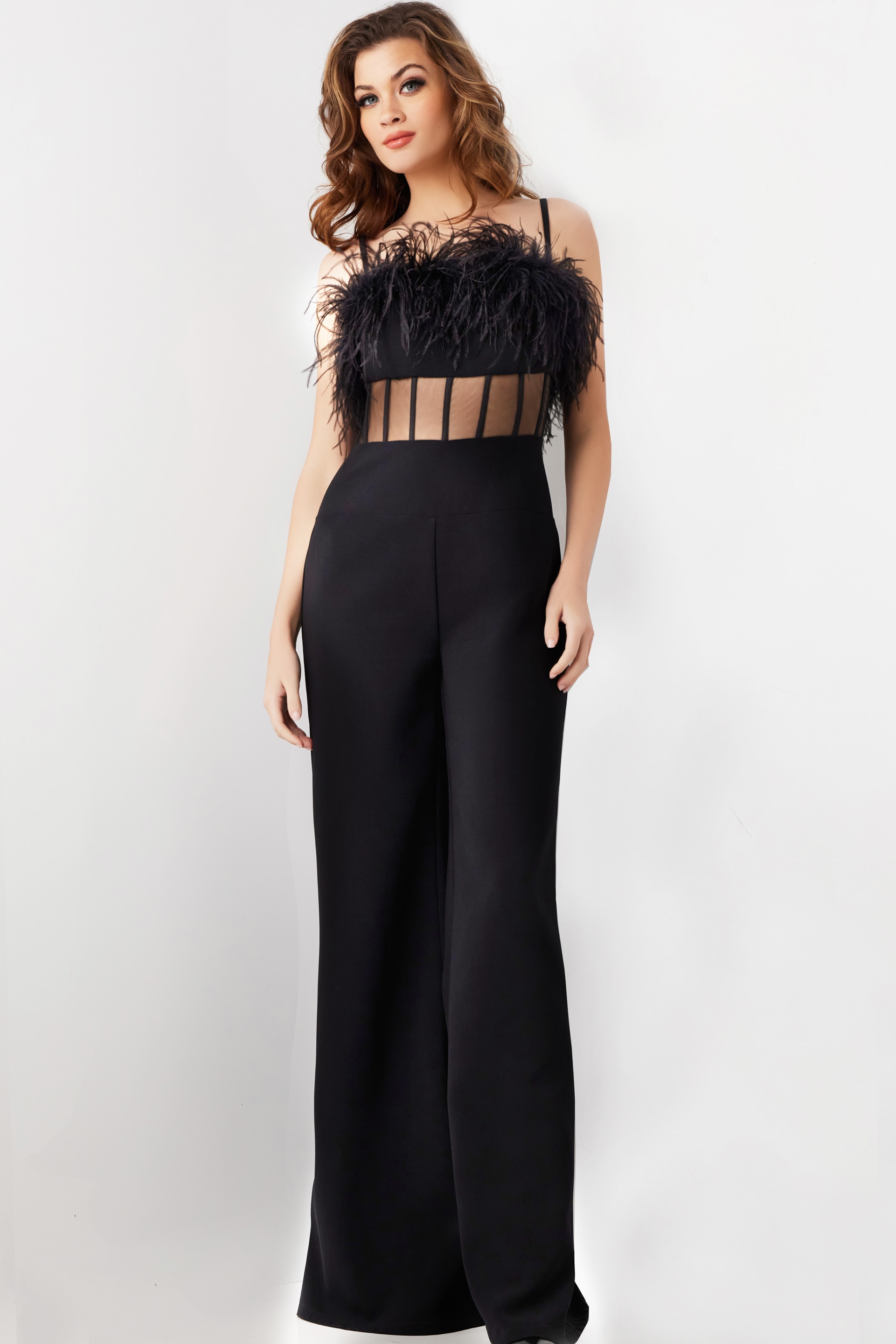 Black Sheer Bodice Spaghetti Straps Jumpsuit 24144 – Elevate your style game with this fabulous Black Sheer Bodice Spaghetti Straps Jumpsuit. Designed with a captivating sheer bodice adorned with exquisite feather details, this jumpsuit is the epitome of elegance and bold fashion. The sleeveless design coupled with spaghetti straps makes it an ideal choice for a chic evening out. The jumpsuit features a flattering straight-leg silhouette that elongates your figure, adding a touch of sophisticated allure. Made from high-quality fabric that provides an exceptional fit, this jumpsuit ensures both comfort and style. Perfect for making a statement at any event, this jumpsuit is a must-have addition to your wardrobe.