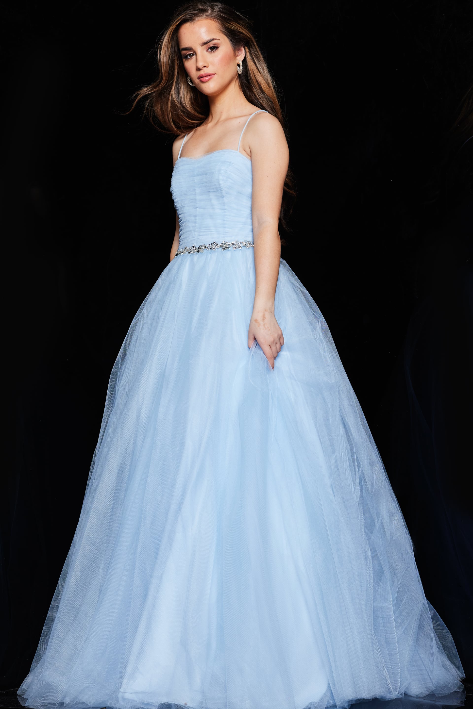 Blue Crystal Embellished Belt Tulle Jovani Girls Dress K66712 – This enchanting ballgown is truly fit for a princess. Featuring a beaded crystal embellished belt that cinches the waist, this dress boasts an elegant floor-length layered tulle skirt that creates a magical, voluminous silhouette. The classic sweetheart neckline and sleeveless design enhance its ethereal beauty while providing a comfortable fit for any special occasion. The soft blue hue adds a dreamy quality to the dress, making it perfect for prom, quinceañera, or any formal event. Crafted from high-quality tulle, this dress offers a delicate yet striking appeal. Whether you’re making an entrance at a ball or shining on stage, the Blue Crystal Embellished Belt Tulle Jovani Girls Dress K66712 will make you feel like royalty.