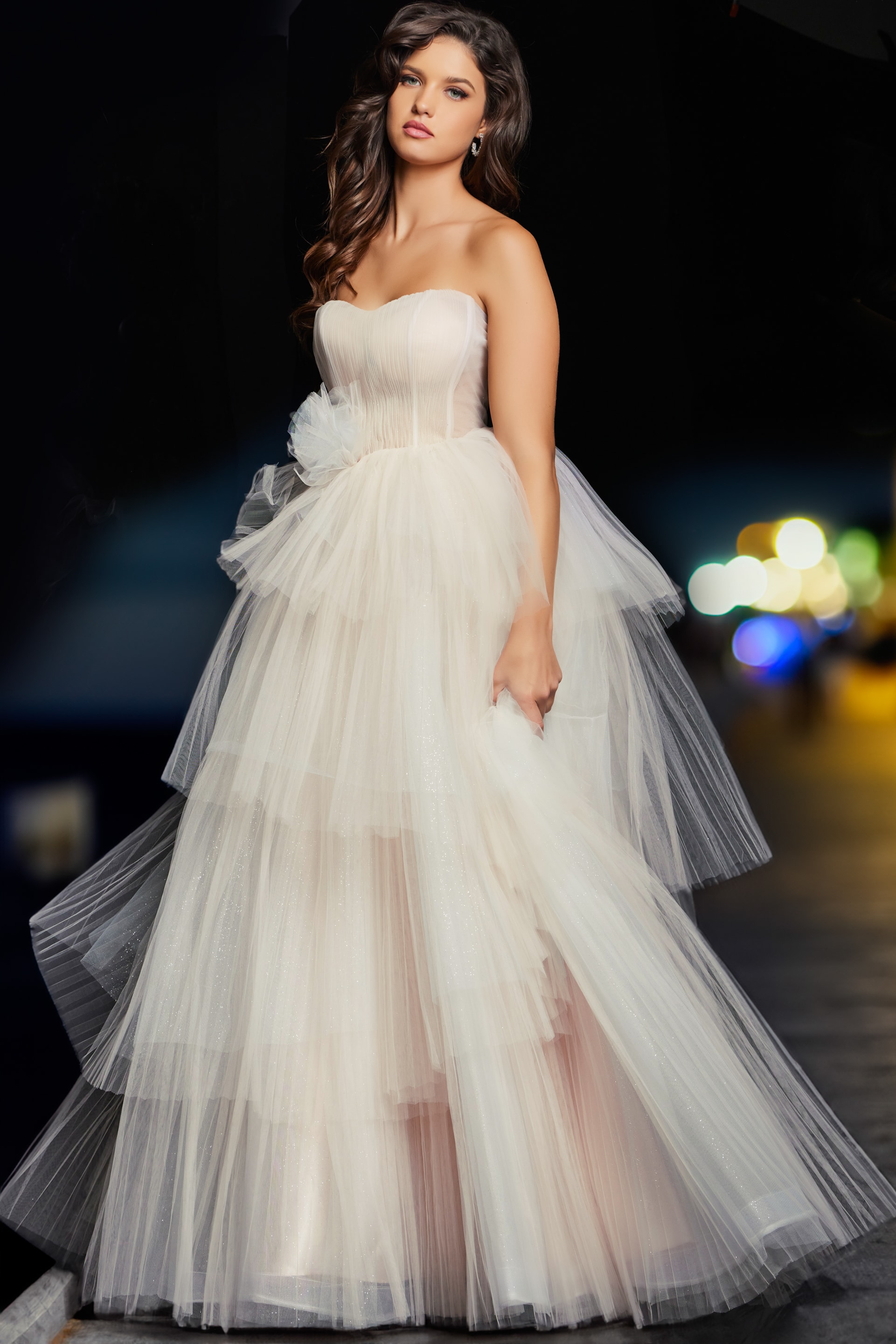 The Jovani 38537 is an enchanting formal ballgown designed for making a captivating and elegant statement at special occasions. Crafted from shimmer tulle, this gown brings a touch of sparkle and luminosity to the design, creating a magical and ethereal look.