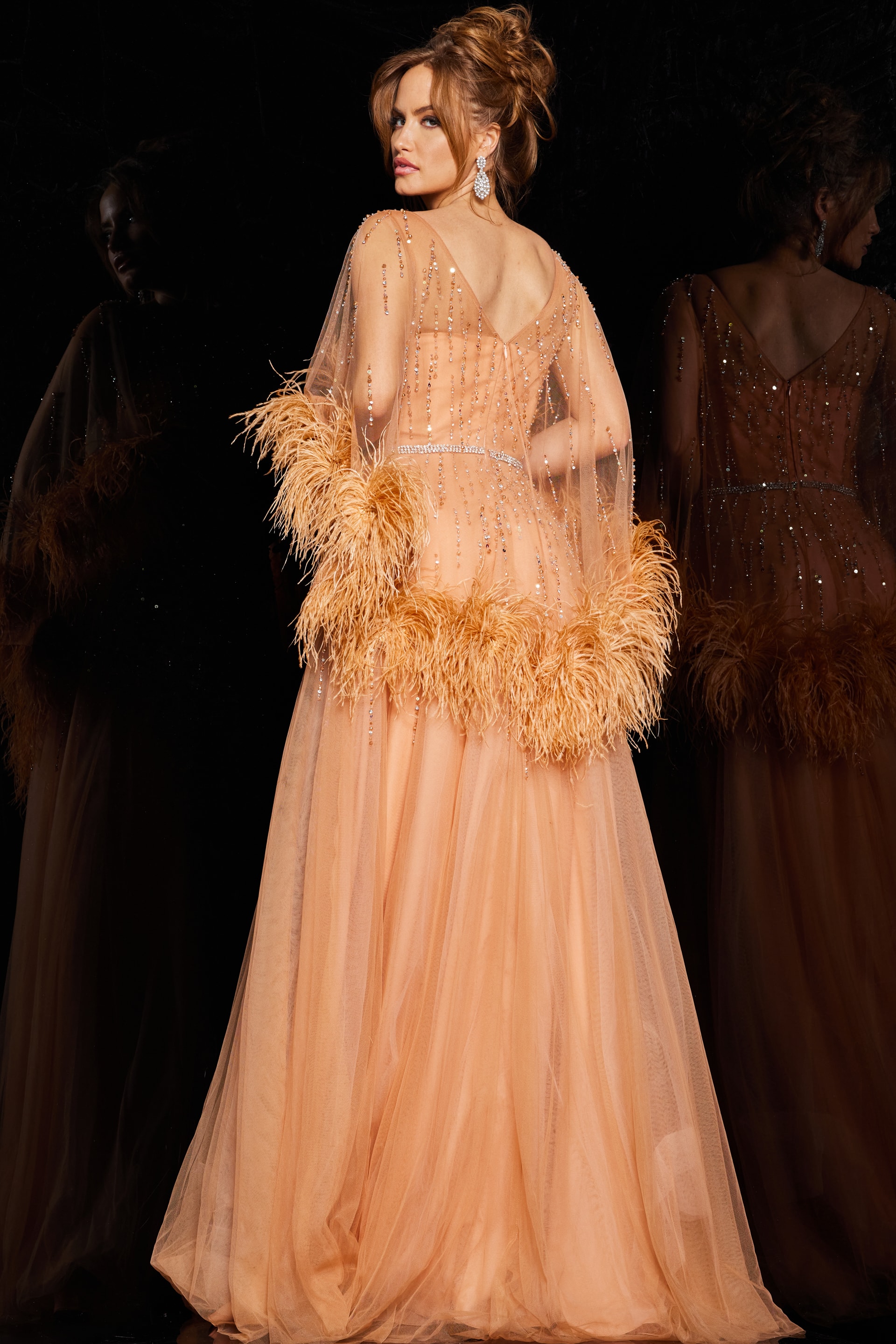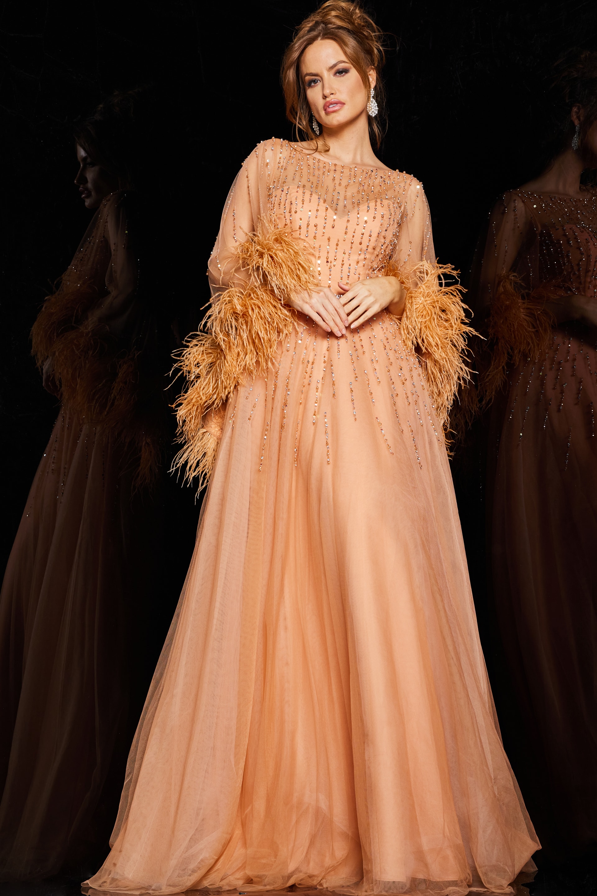 Cafe Beaded Sweetheart Neckline Ballgown 24559 – Exude elegance and charm in this stunning cafe-colored ballgown that features a captivating sweetheart neckline. This intricately beaded dress dazzles with its exquisite detailing, designed to shimmer and sparkle under the light. The delicate feather embellishments enhance its luxurious appeal, adding a touch of glamour to every movement. Crafted from soft, flowing tulle, this floor-length ballgown is perfect for making a grand entrance at any formal event. Feel effortlessly beautiful in this sleeveless, beaded marvel that promises to turn heads and leave a lasting impression.
