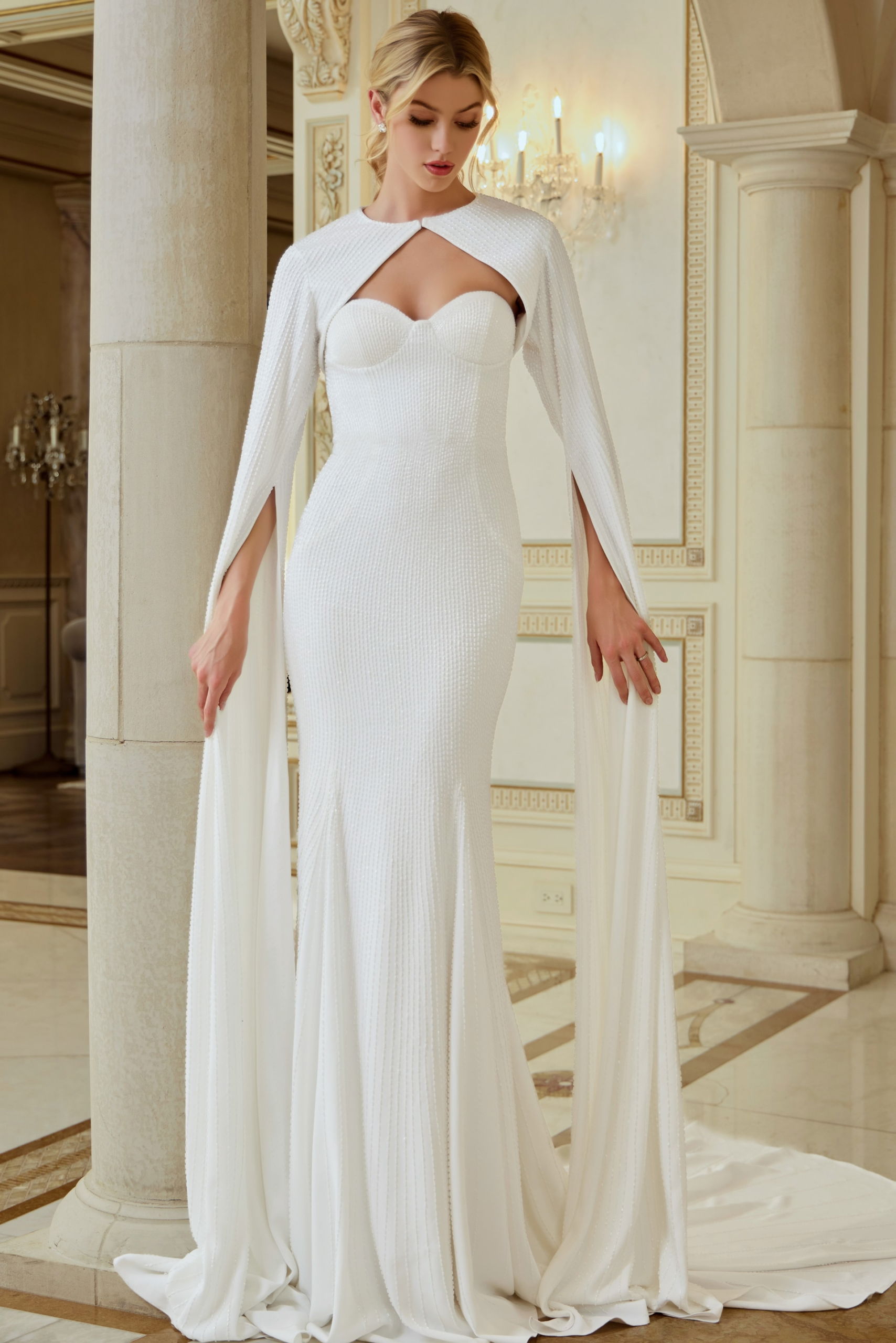 Draped Cape Sleeves, Fitted Bodice, Clean Modern Lines