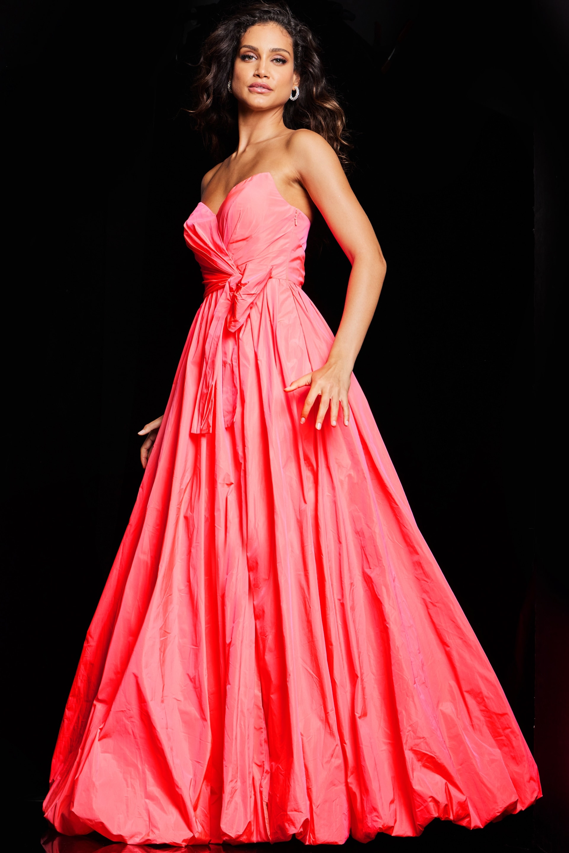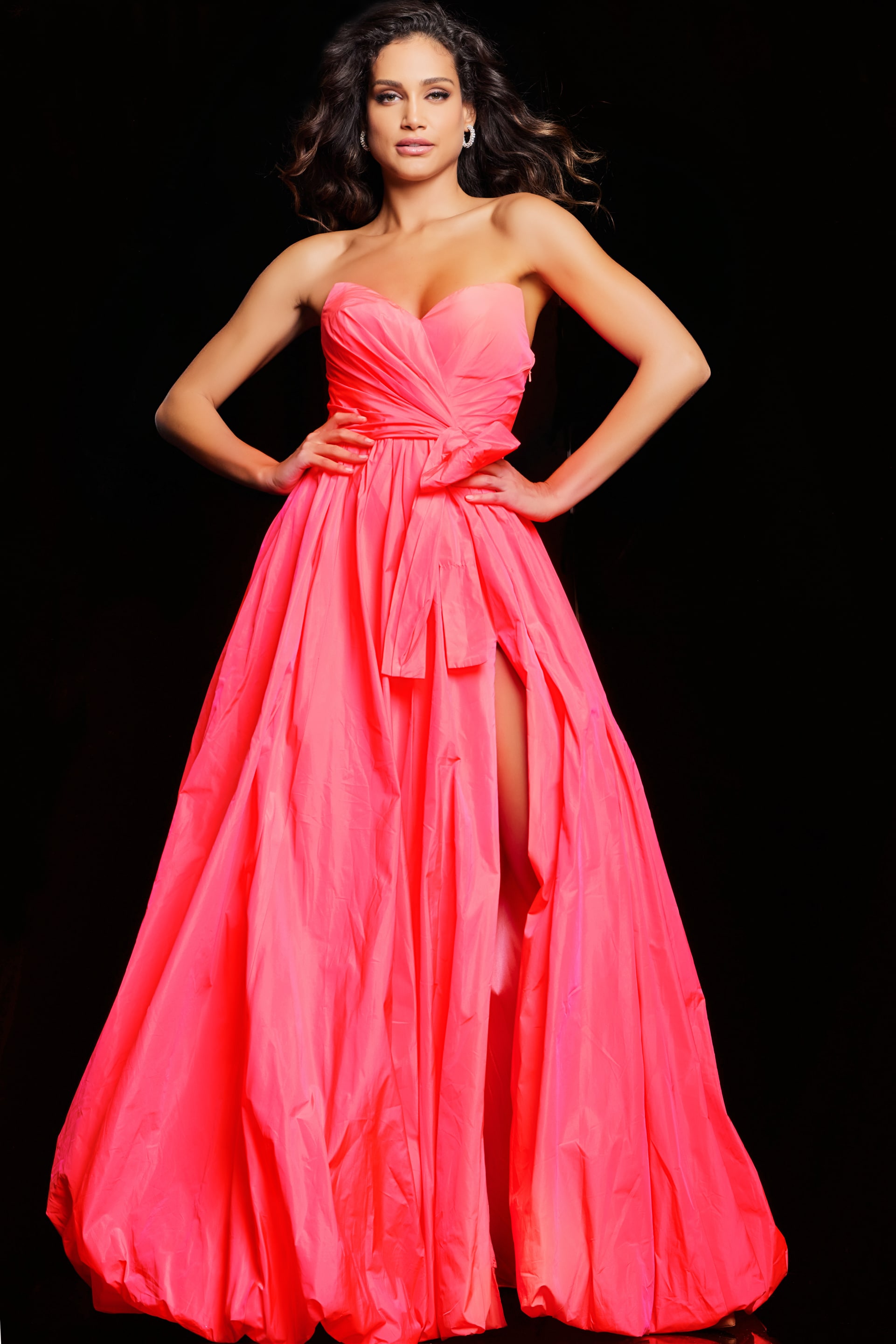 The Jovani 38382 is a truly elegant formal gown designed to make a statement. Crafted from luxurious taffeta, this A-line gown features a universally flattering silhouette. It boasts a long bubble skirt with a tasteful slit, creating a graceful and dramatic appearance. The high waist is adorned with a beautiful bow detail, adding a touch of charm to the design.
