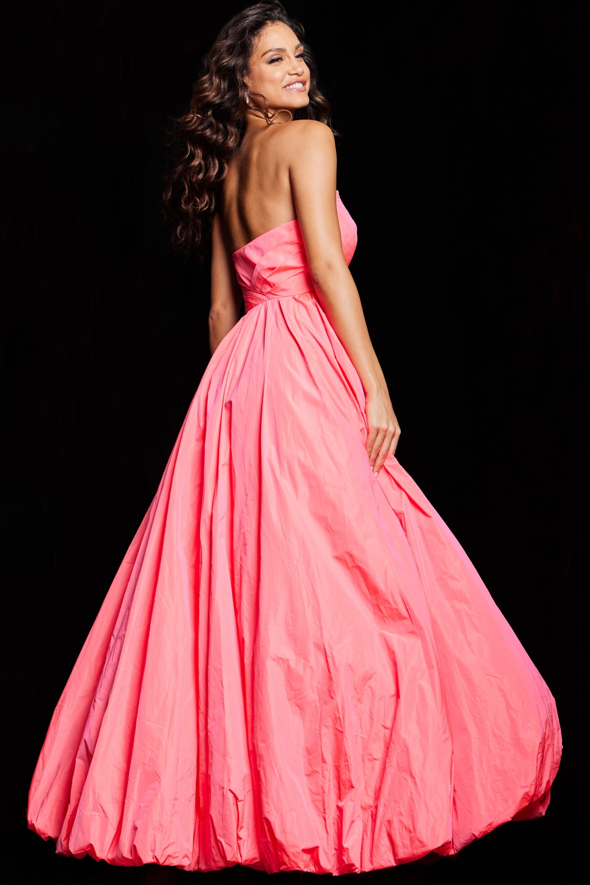 The floor-length skirt has a bubble hem, creating a sense of volume and adding to the gown’s regal appearance. The side zipper ensures a secure and comfortable fit. The gown is designed with a straight back, giving it a classic and timeless look.