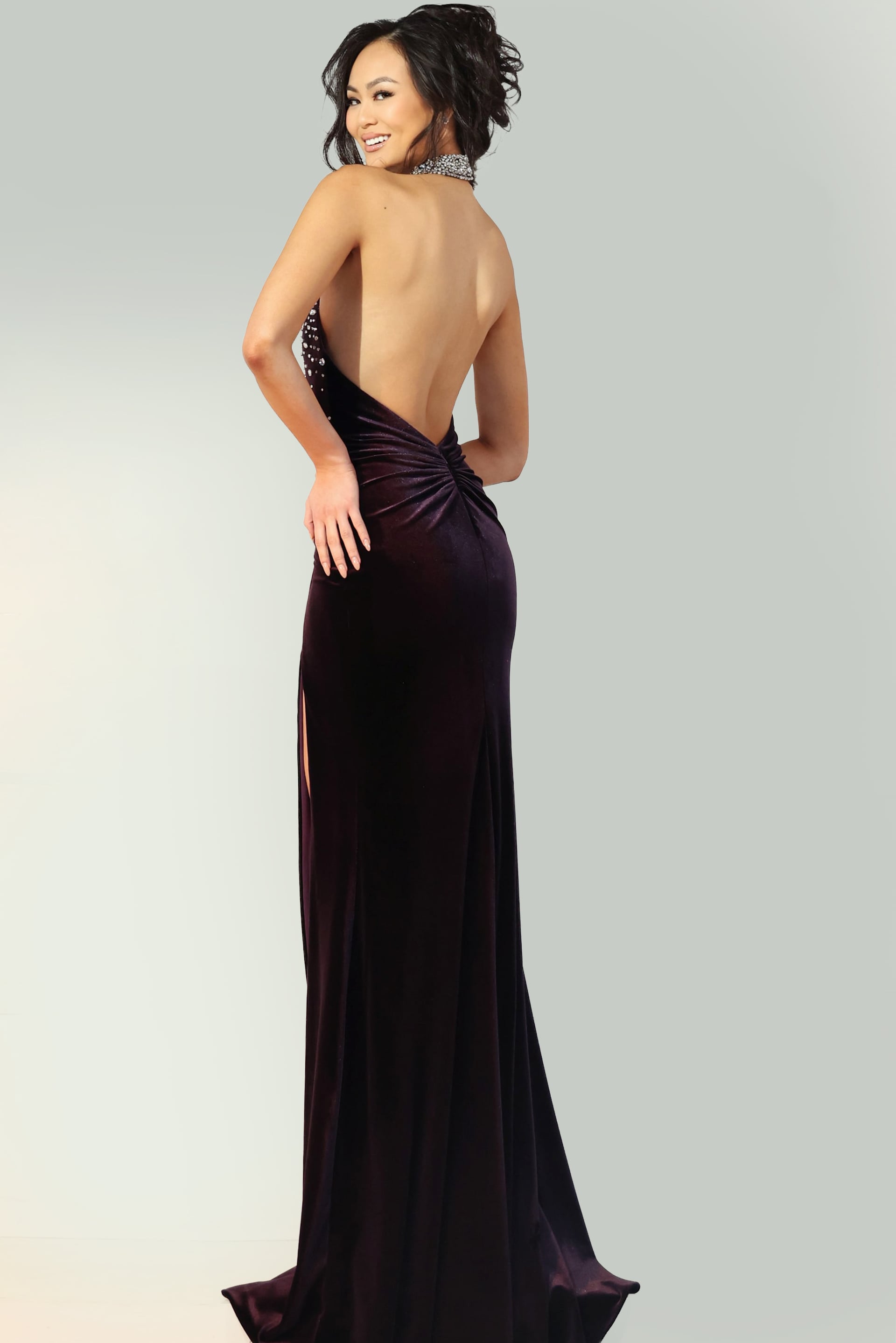 Crystal Embellished Backless Velvet Dress 48960