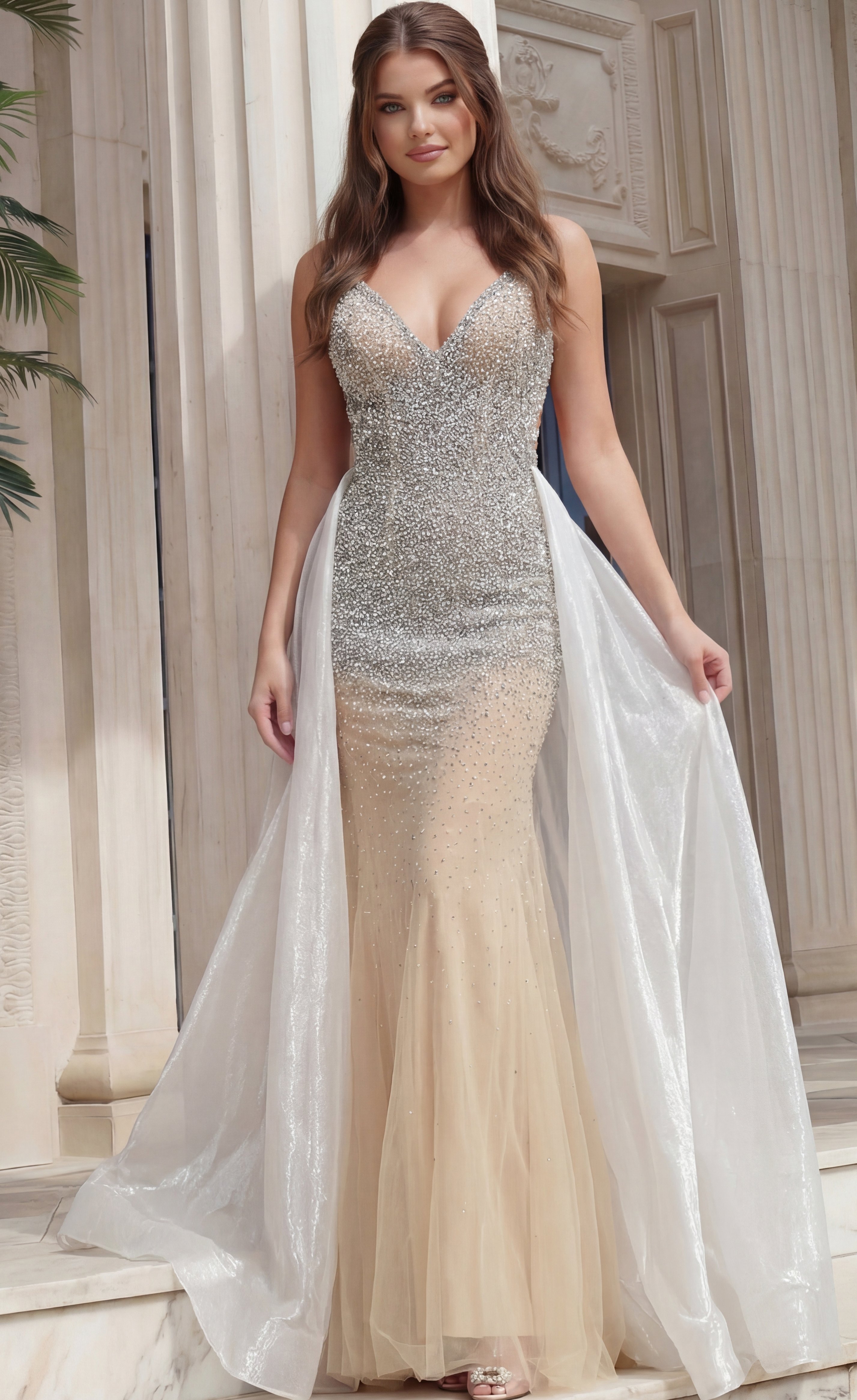 Allover Hand Beading, Gradient Embellishment, Sheer Overlay Skirt, Crystal Accents, Detachable Sheer Cape
