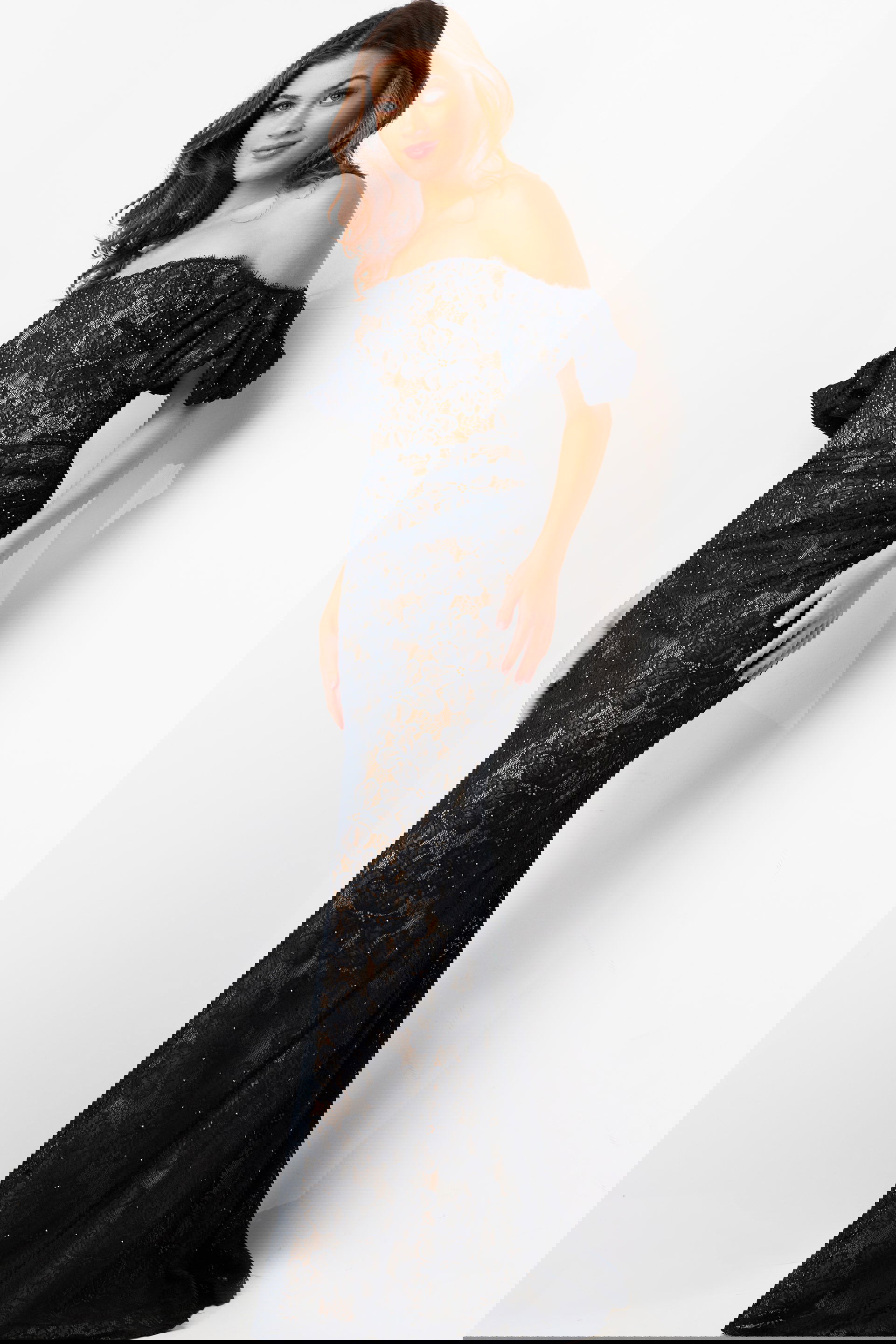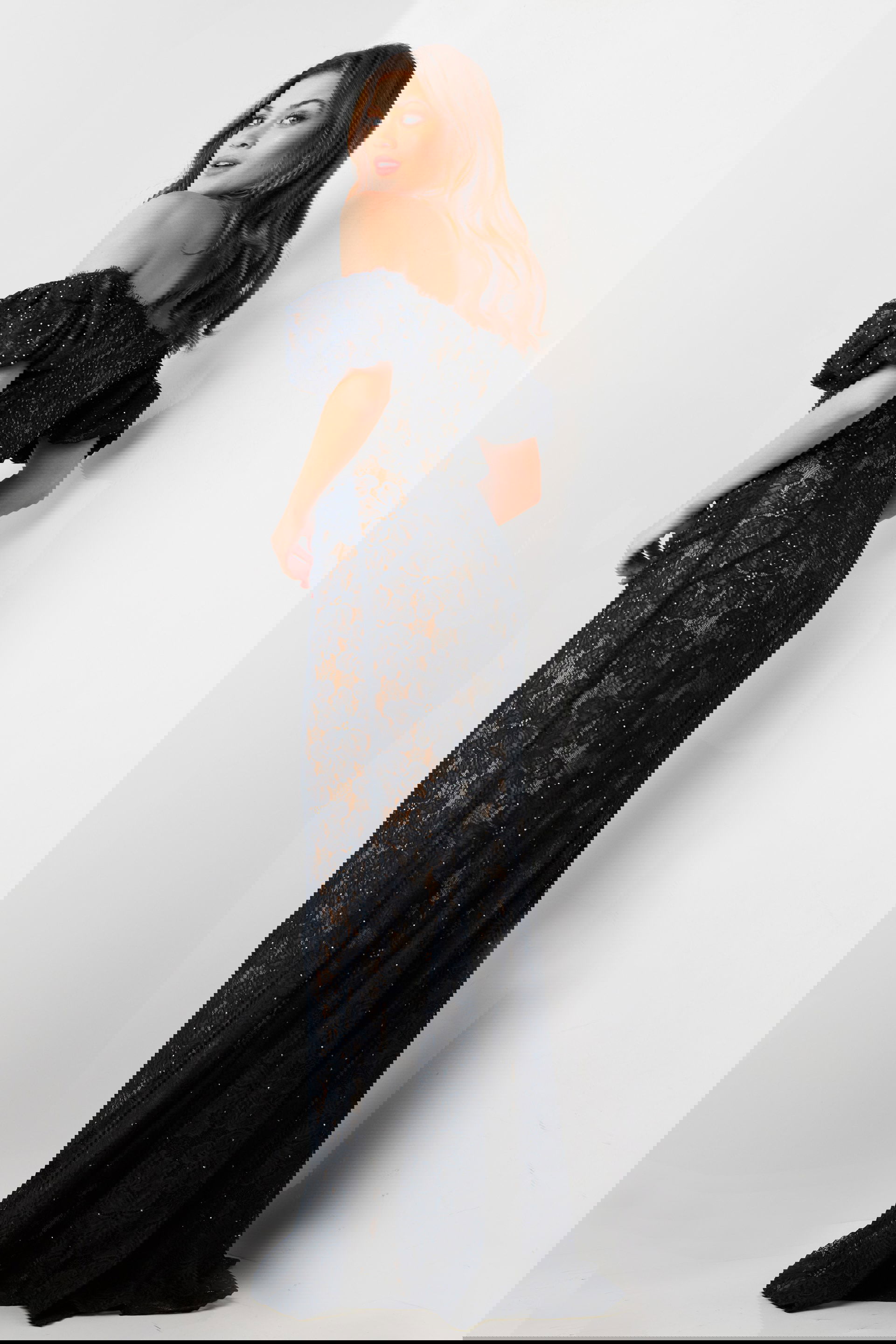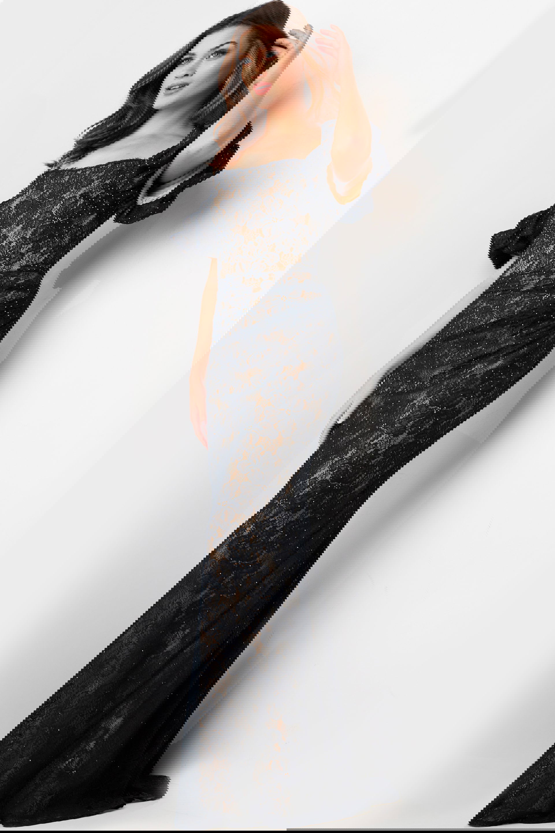 Enhancing the allure of the lace, heat-set stones adorn the fabric, adding a subtle shimmer and luxurious touch to the ensemble. Fully lined for comfort and coverage, this dress ensures a seamless fit and feel throughout the evening.