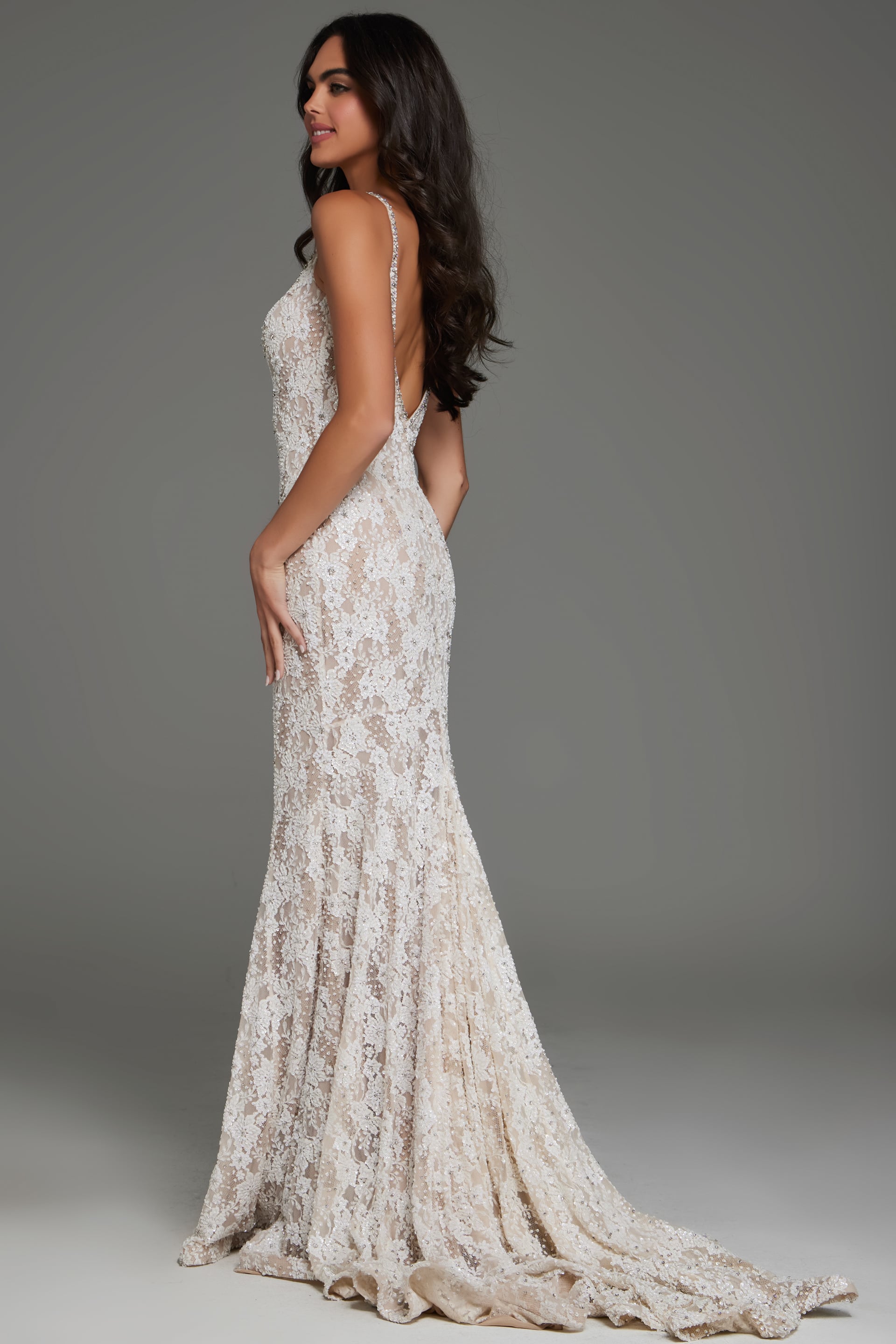 This elegant gown features a fitted silhouette with a floor-length hem, designed in a classic white lace. It showcases a delicate V-neckline complemented by thin straps, offering a timeless and graceful look. The dress is sleeveless and adorned with intricate floral lace detailing throughout, exuding sophistication. The back is elegantly low-cut, adding a subtle allure to the design.