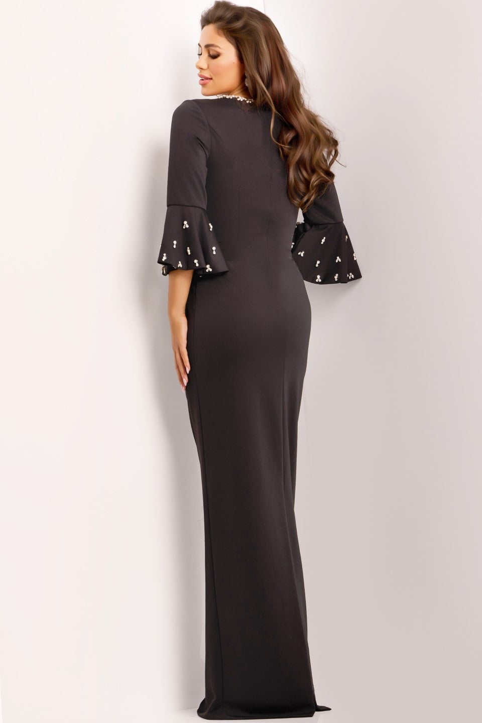 This sophisticated gown features a fitted silhouette that gracefully flows into a full-length skirt, accentuating the figure. The V-neckline is adorned with delicate beaded detailing, adding a touch of elegance. The dress is completed with bell sleeves that offer a dramatic flair. Perfect for formal events, it blends timeless design with modern style.