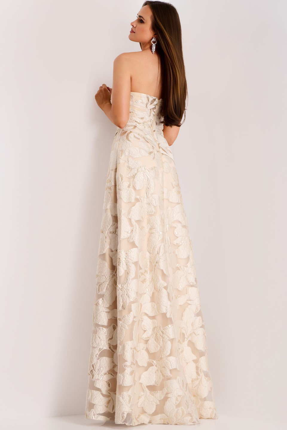 This stunning strapless A-line gown features exquisite floral embroidery throughout its full-length silhouette. The dress boasts a straight neckline, creating an elegant frame for the décolletage. Perfect for sophisticated occasions, its luxurious texture and graceful flow offer an enchanting presence. The gown is complemented by a matching shawl, adding a touch of versatility and style.