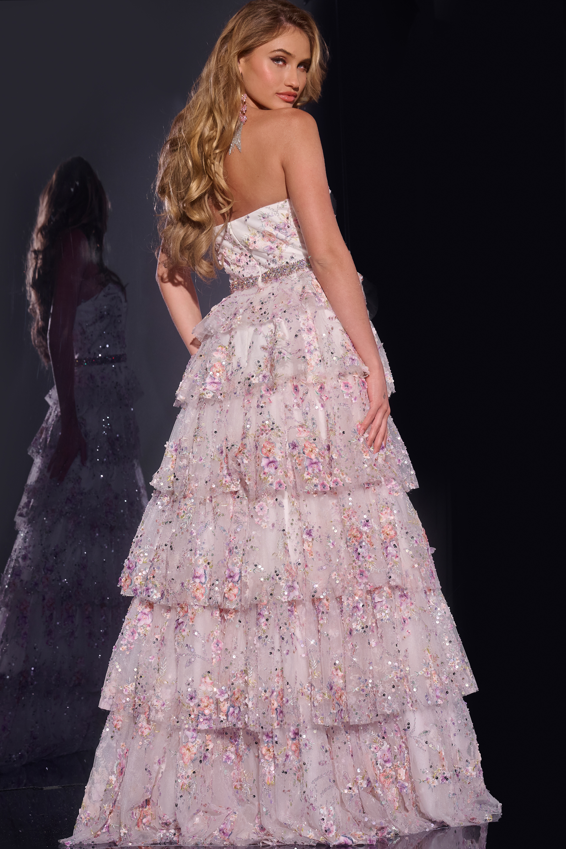 Elegant Strapless Floral Sequin Ball Gown 42190. Embrace your inner princess with this stunning ball gown featuring a mesmerizing sequin detail that shimmers with every step. The strapless bodice is adorned with delicate floral print and beaded embellishments, ensuring you make a grand entrance. The tiered, floor-length skirt adds layers of sophistication and volume, ideal for making a statement at any formal event. Crafted from luxurious tulle fabric, this gown is both ethereal and opulent, making it perfect for prom, wedding occasions, or a grand gala.