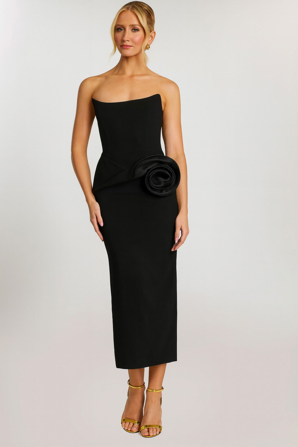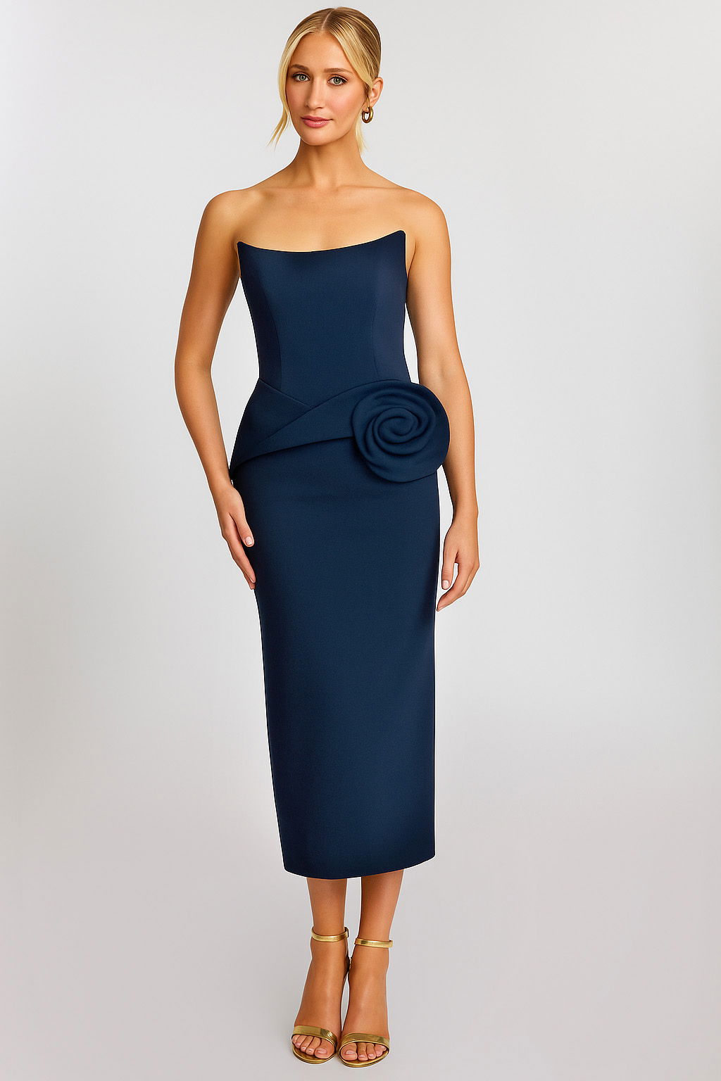 Elegant Strapless Midi Dress with Satin Rose Detail 48208