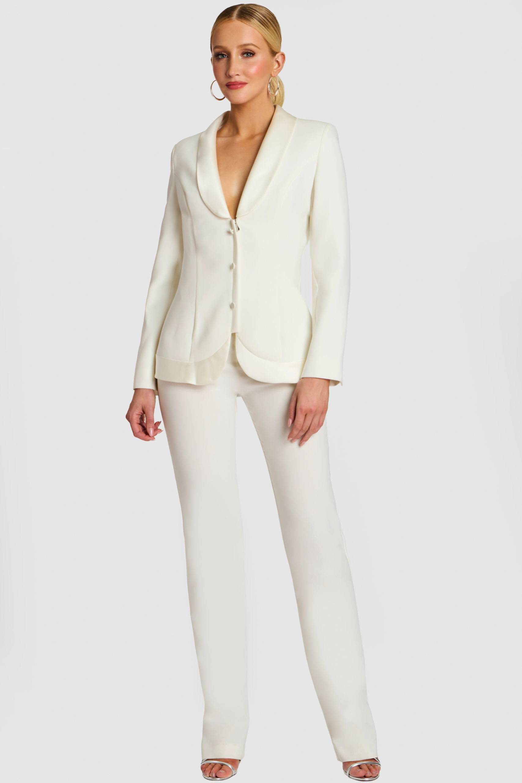 Elegant White Pantsuit 25981 – Unveil your sophisticated side with this luxurious white pantsuit. Crafted from rich crepe fabric, this jumpsuit features a sleek, tailored fit that exudes confidence and chic elegance. The simple yet stylish silhouette ensures a flattering figure, while the long sleeves add a touch of class. Perfect for upscale gatherings, professional settings, or standing out at glamorous events, this ensemble will make you feel poised and distinguished.