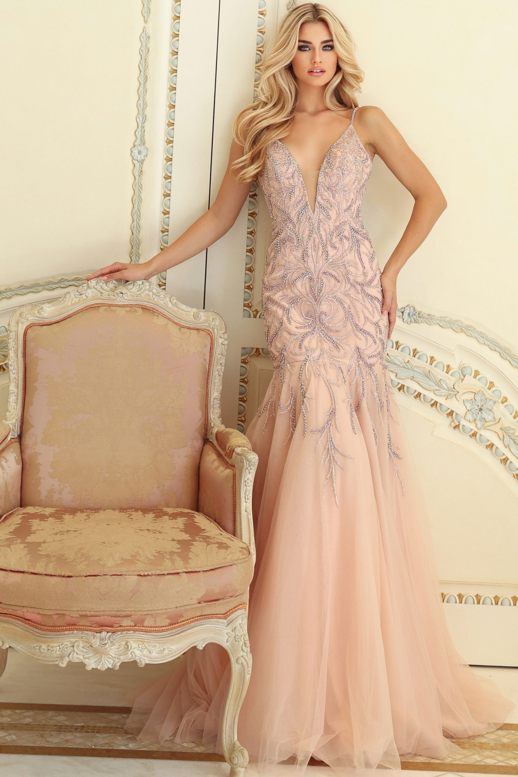 Embellished Fitted Gown With Deep V Neck S62456