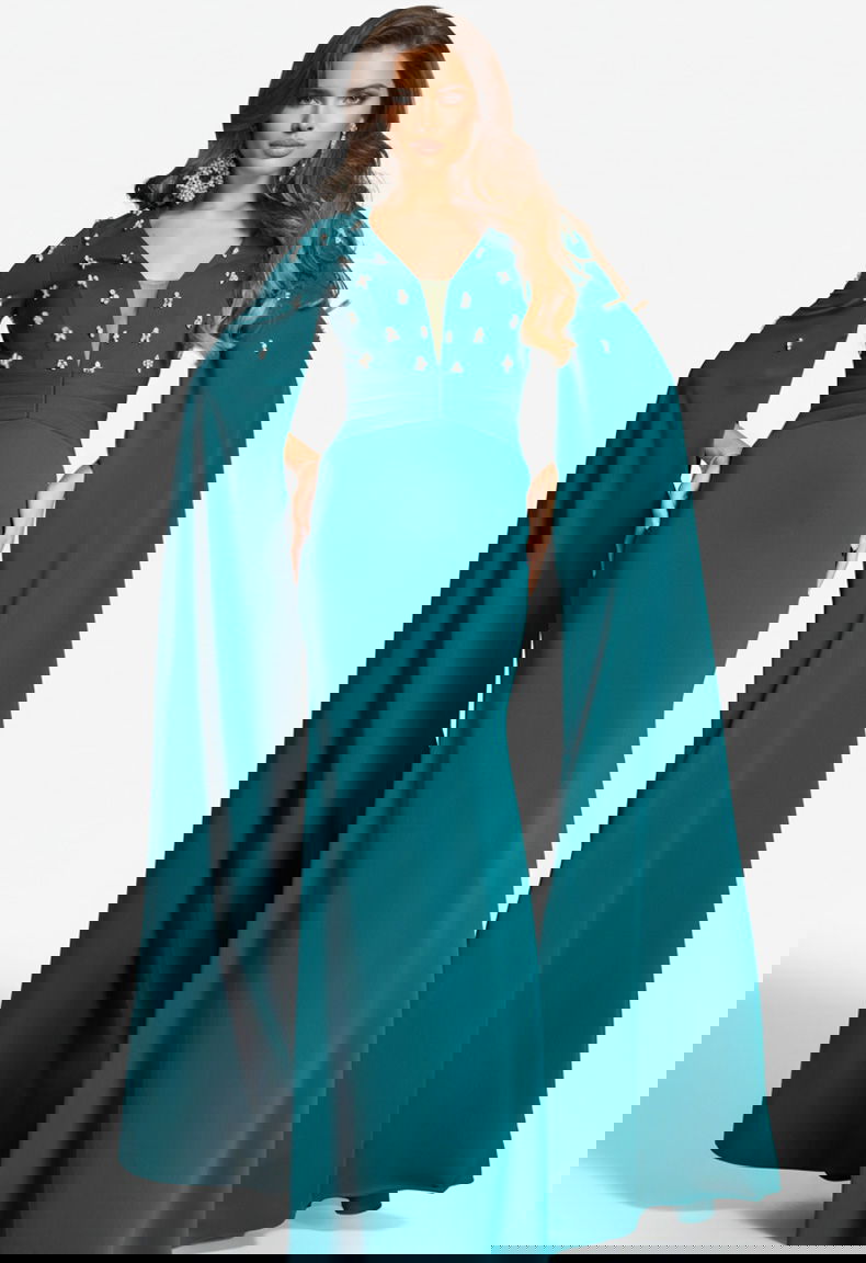 Elegant and striking, this dress features a floor-length design with a fitted silhouette that glides over the body gracefully. The deep V-neckline adds a touch of allure, complemented by long, dramatic cape sleeves that flow elegantly down the arms. Embellishments adorn the bodice, adding a hint of sparkle that enhances its sophisticated appeal. Crafted from a rich emerald fabric, this gown is perfect for making a bold statement at any formal event.