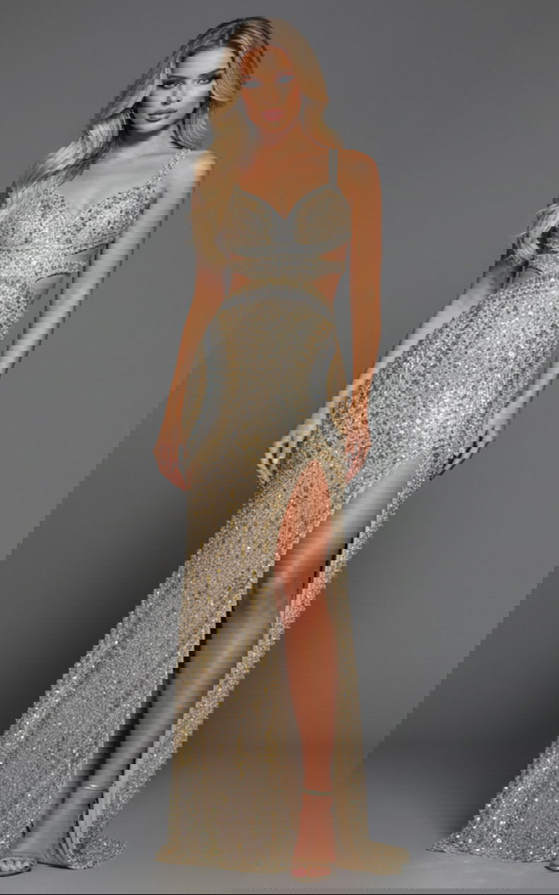 The mesmerizing Embellished Gown with Open Back and High Slit 40242 is a vision of elegance. This stunning gown showcases a figure-flattering fitted silhouette adorned with intricate sequin details that catch the light with every movement. The captivating open back design adds a touch of allure, while the high slit ensures you make a statement with every step. The gown features a floor-length cut and a flattering V-neckline, making it the perfect choice for any special occasion. With its sleeveless design, this gown allows you to accessorize freely and showcase your style.