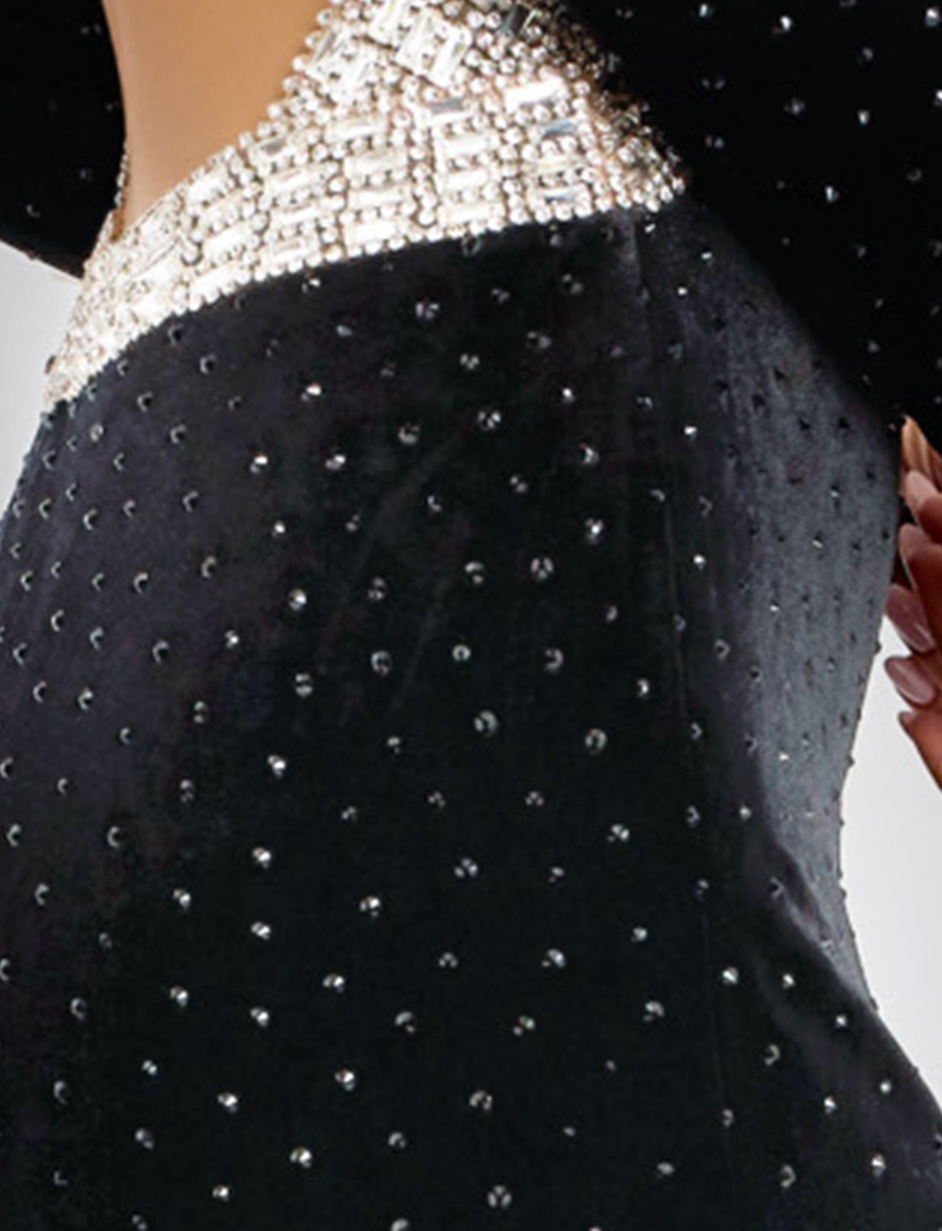 This stunning full-length gown features a sophisticated fitted silhouette, gracefully sculpting the figure for an elegant look. The high neckline is richly embellished, complementing the shimmering details throughout the dress. Long sleeves adorned with intricate embellishments add a touch of elegance, while the captivating open back adds a dramatic flair. This dress is perfect for any formal occasion, offering a combination of sophistication and glamour.